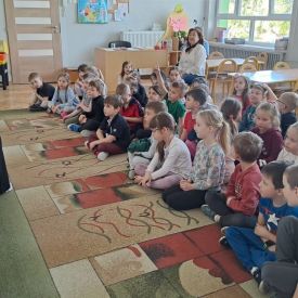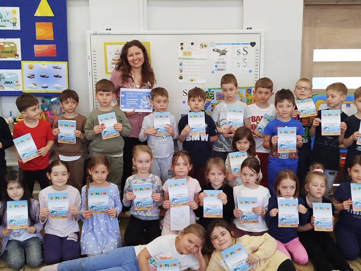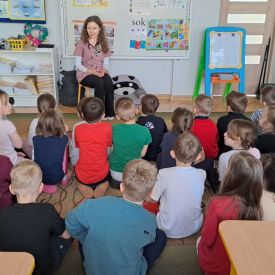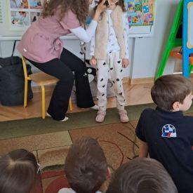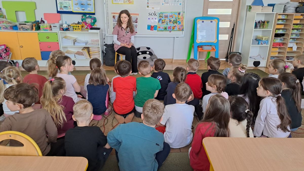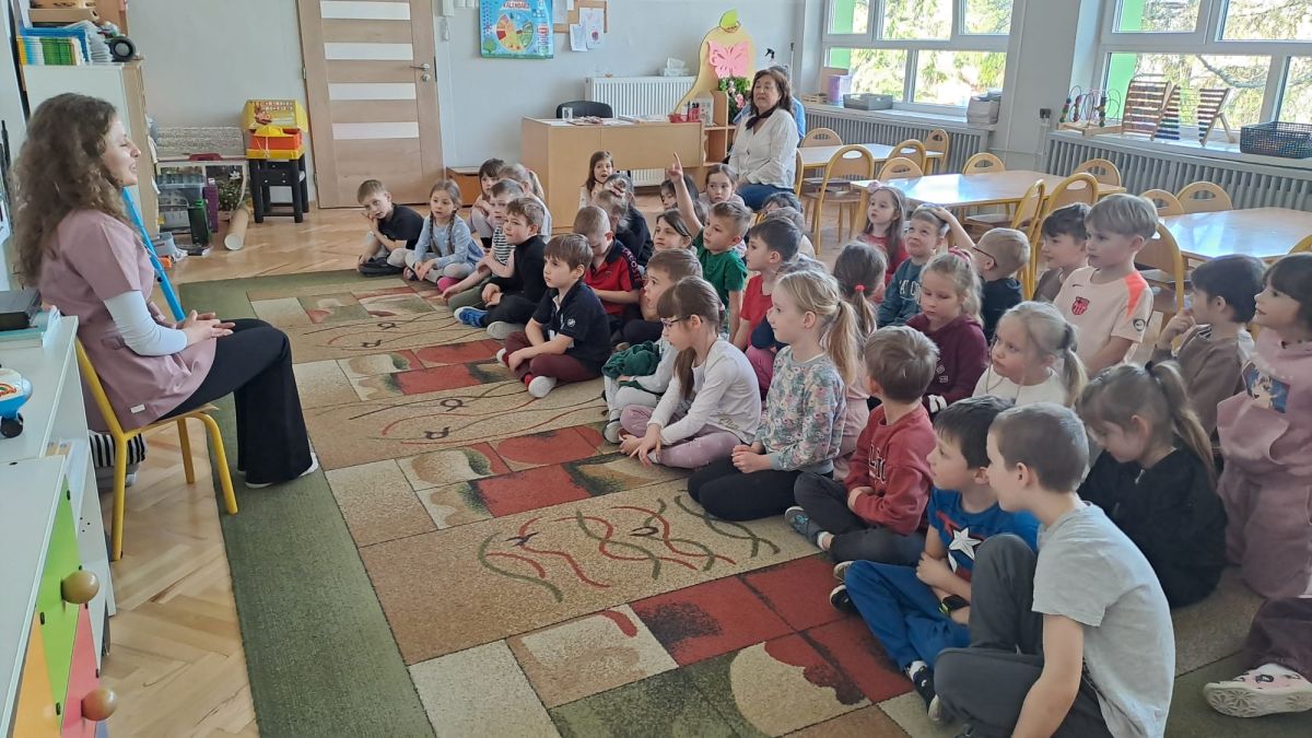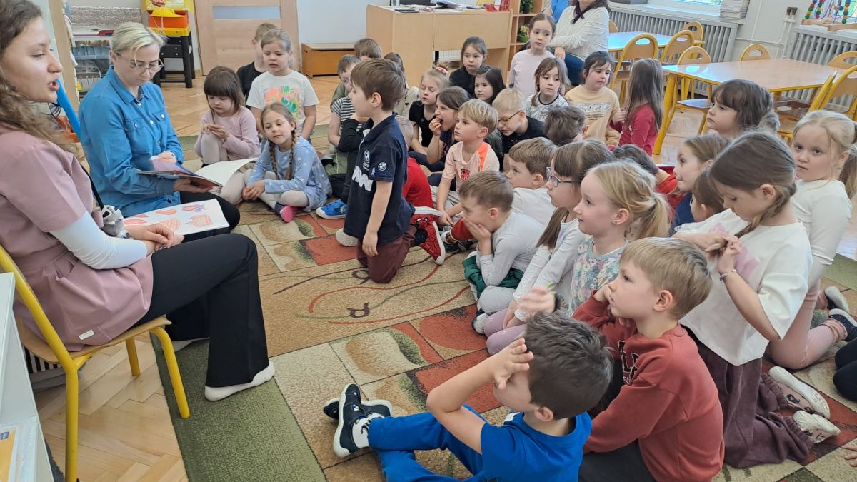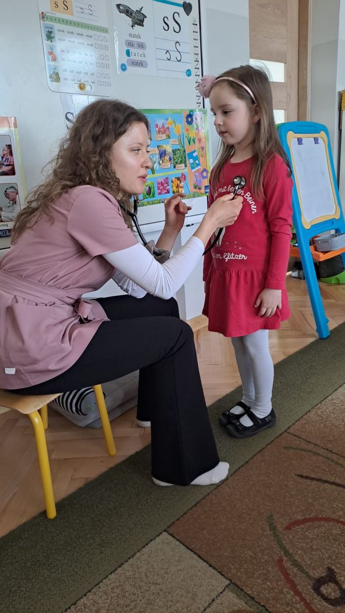 Przedszkolaki bardzo chętnie brały udział w zajęciach – wykazały się dużą wiedzą, odwagą oraz ogromną ciekawością. Zadawały mnóstwo pytań, na które pani Maria cierpliwie i z uśmiechem odpowiadała, tworząc ciepłą i przyjazną atmosferę. W dalszej części spotkania dzieci dowiedziały się, jakie narządy znajdują się w organizmie człowieka, za co odpowiadają oraz dlaczego tak ważne jest dbanie o zdrowie. Pani doktor podkreśliła, jak istotna jest zdrowa dieta, wskazując, jakie produkty warto spożywać, a jakich unikać, aby jak najdłużej cieszyć się zdrowiem i energią. Spotkanie było nie tylko bardzo pouczające, ale również niezwykle interesujące i inspirujące. Na zakończenie pani doktor wręczyła starszakom dyplomy i naklejki, co sprawiło dzieciom ogromną radość.