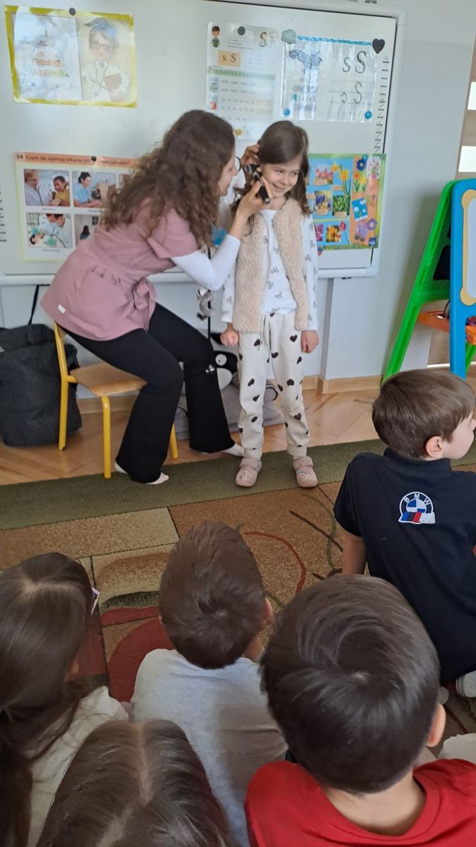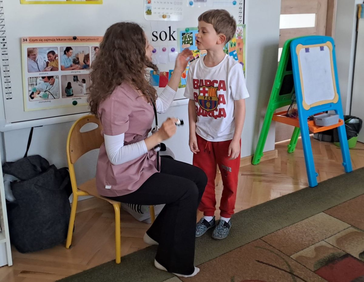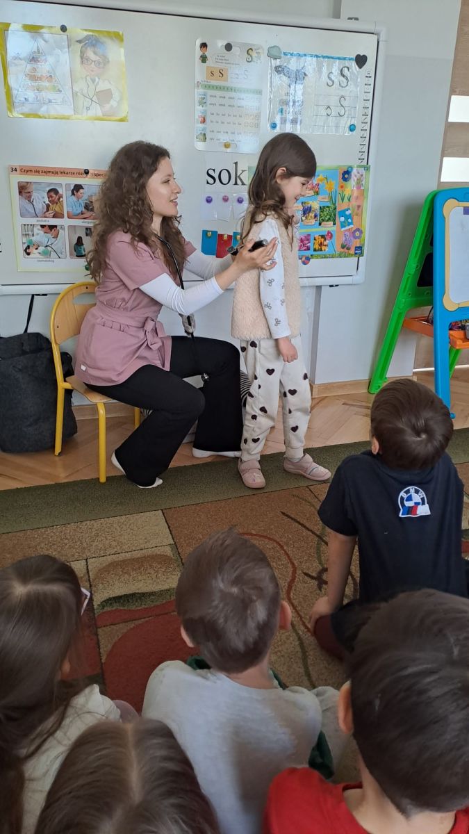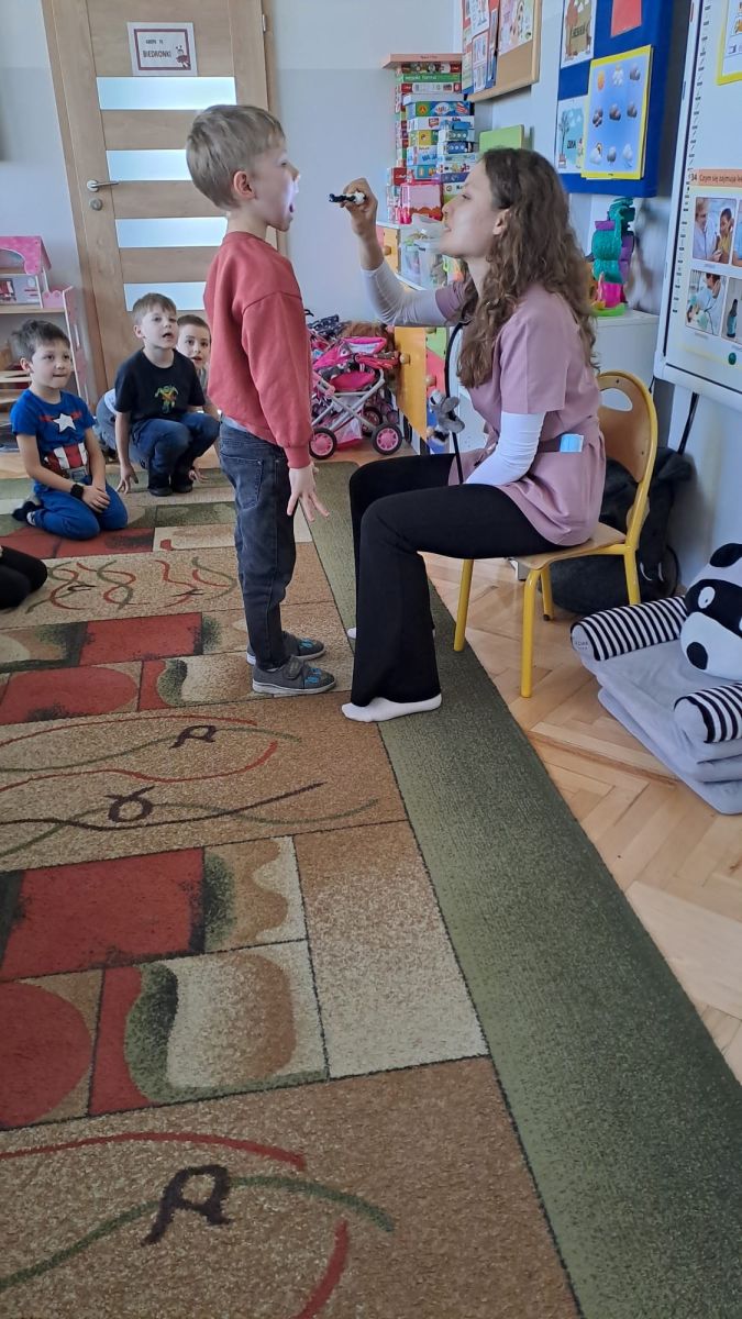 W naszym przedszkolu odbyło się wyjątkowe spotkanie edukacyjne. Grupy „Krasnale” oraz „Biedronki” miały przyjemność gościć panią doktor Marię Górej ze Świętokrzyskiego Centrum Pediatrii na Czarnowie. Dzieci uczestniczyły w niezwykle ciekawych zajęciach, podczas których poznały zawód pediatry. Pani doktor w przystępny i bardzo interesujący sposób opowiedziała, jak wygląda wizyta lekarska w gabinecie. Zaprezentowała również sprzęt medyczny, którego używa na co dzień, m.in. stetoskop, otoskop czy ciśnieniomierz, wyjaśniając, do czego służą i jak pomagają w diagnozowaniu pacjentów. Dzieci miały okazję nie tylko zobaczyć, ale także spróbować swoich sił w roli małych lekarzy.