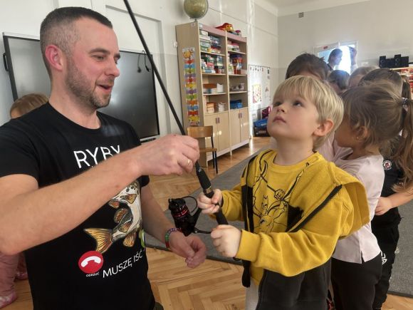 „Jeżyki” odwiedził dziś tata Toli, który opowiedział dzieciom o swoim wyjątkowym hobby – wędkarstwie spinningowym. Nasz gość przyniósł ze sobą prawdziwy sprzęt wędkarski, dzięki czemu przedszkolaki mogły z bliska zobaczyć, jak wygląda wędka, kołowrotek, sztuczne przynęty oraz różne akcesoria potrzebne podczas połowów. Dzieci z zaciekawieniem słuchały opowieści o tym, jak wygląda wyprawa na ryby, czego potrzebuje wędkarz i jakie zasady bezpieczeństwa obowiązują nad wodą. Dużo emocji wzbudziła prezentacja kolorowych przynęt oraz możliwość potrzymania prawdziwej wędki. Przedszkolaki dowiedziały się także, czym różni się wędkarstwo spinningowe od innych sposobów łowienia ryb. Na zakończenie spotkania przedszkolaki zadały mnóstwo pytań – o największą złowioną rybę, ulubione miejsca do wędkowania oraz przygody, jakie mogą spotkać wędkarza nad jeziorem czy rzeką. Było to niezwykle ciekawe i inspirujące spotkanie, które przybliżyło dzieciom nową pasję i pokazało, jak wiele radości może dawać kontakt z naturą. Serdecznie dziękujemy tacie Toli za wspaniałą wizytę i poświęcony czas! 🎣