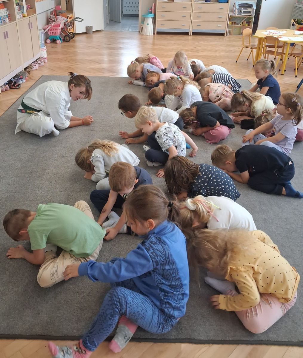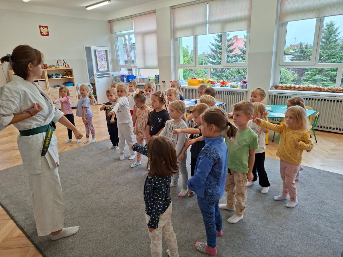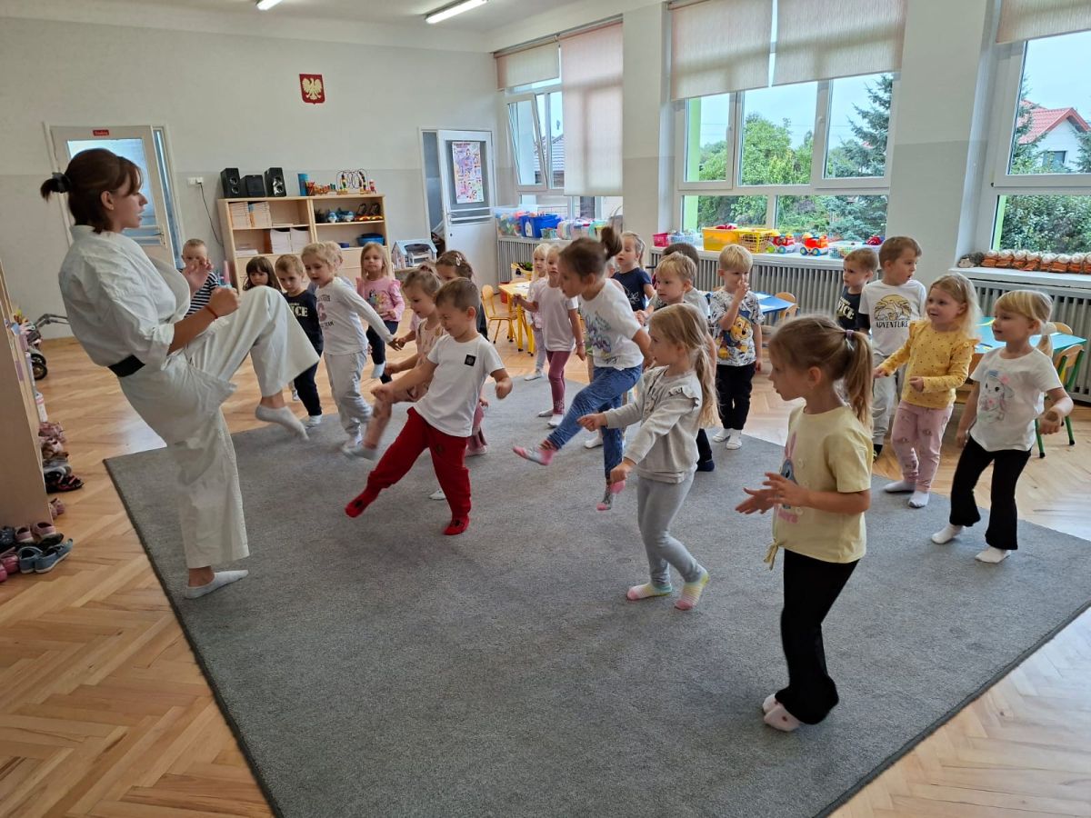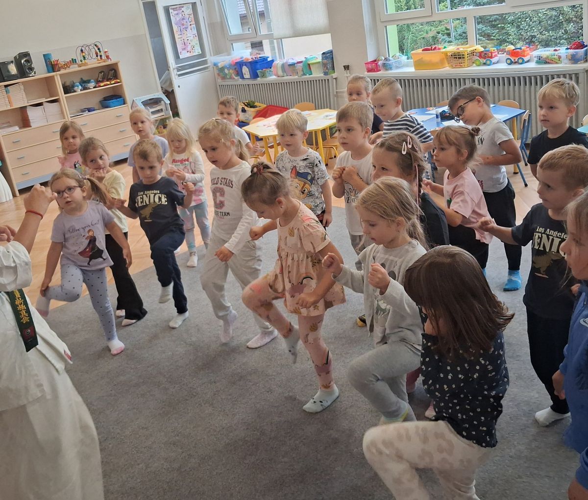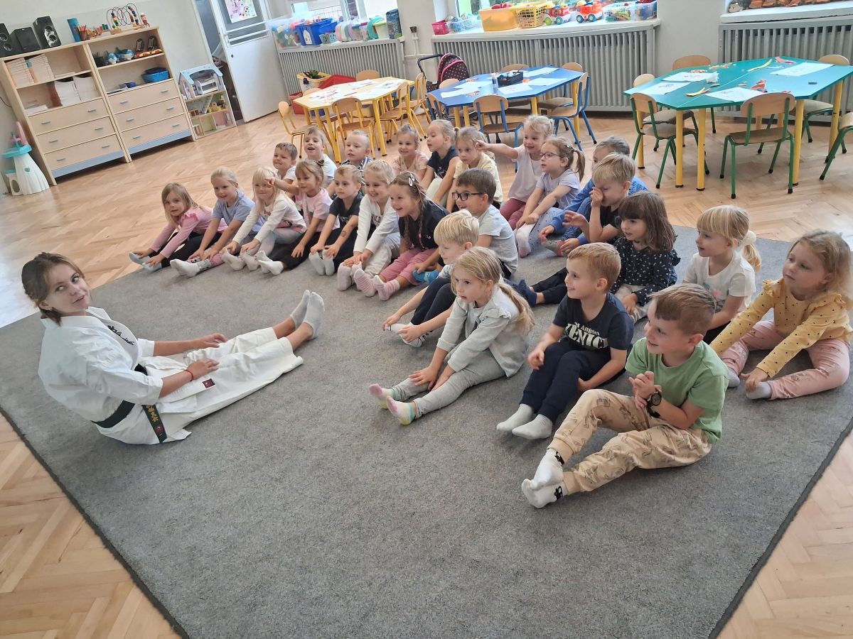 Dzisiaj naszą grupę odwiedziła Wiktoria – siostra Jasia, która trenuje karate i poprowadziła dla dzieci wyjątkowe zajęcia. Spotkanie rozpoczęło się krótką rozgrzewką, a następnie przedszkolaki wzięły udział w zabawach rozwijających koordynację, równowagę, dyscyplinę i koncentrację.