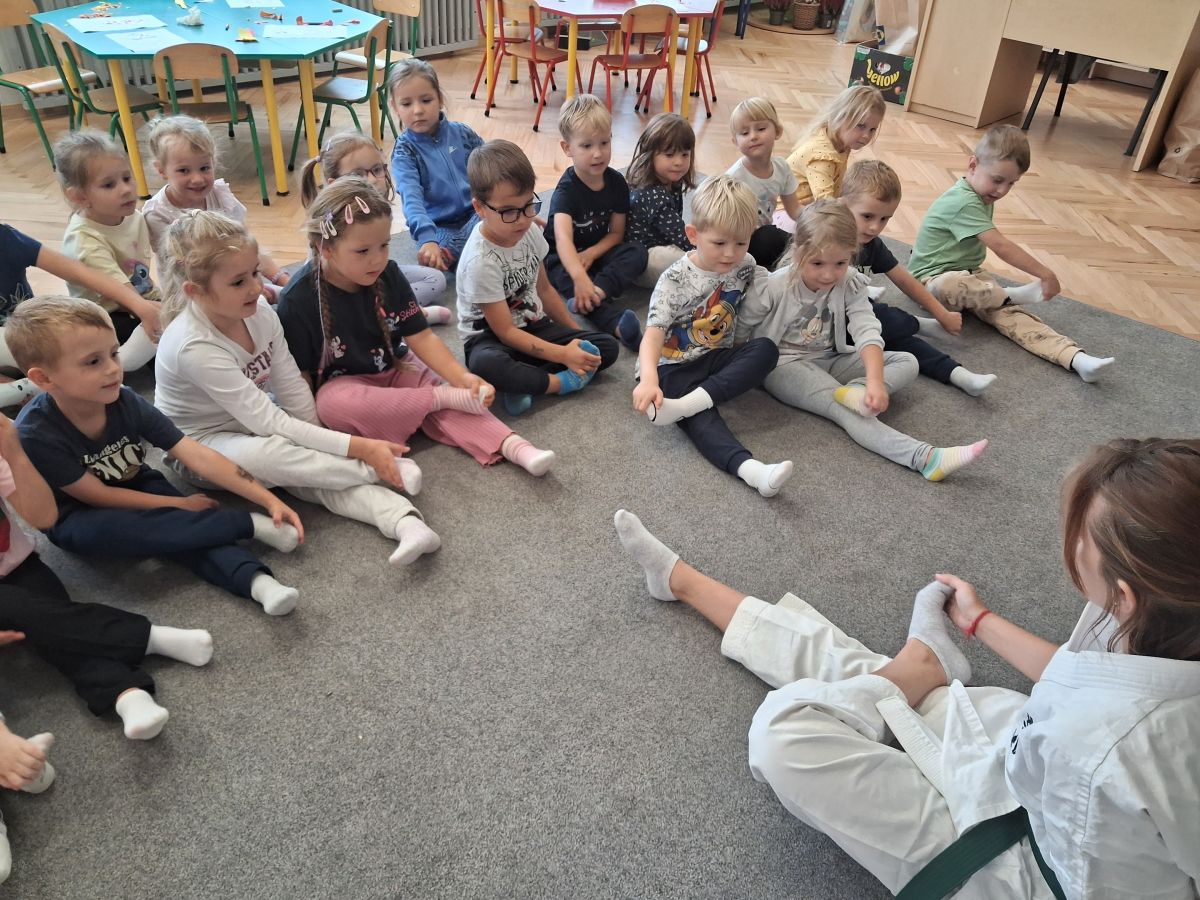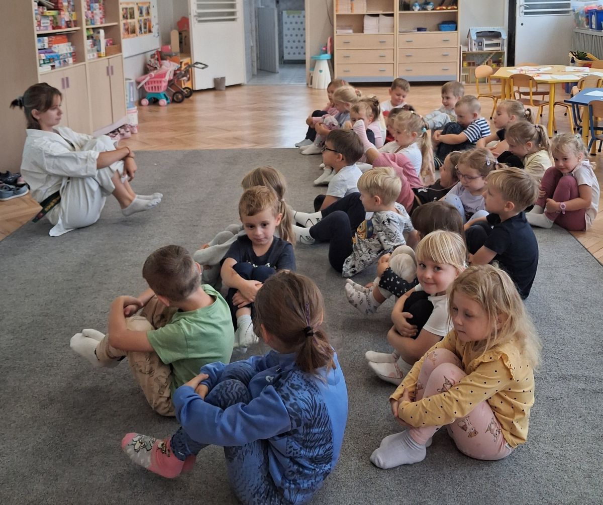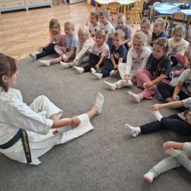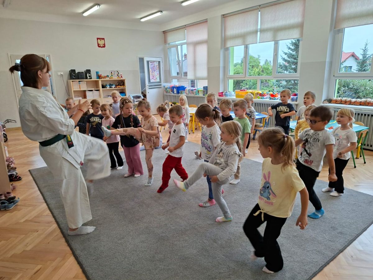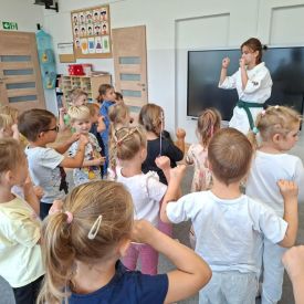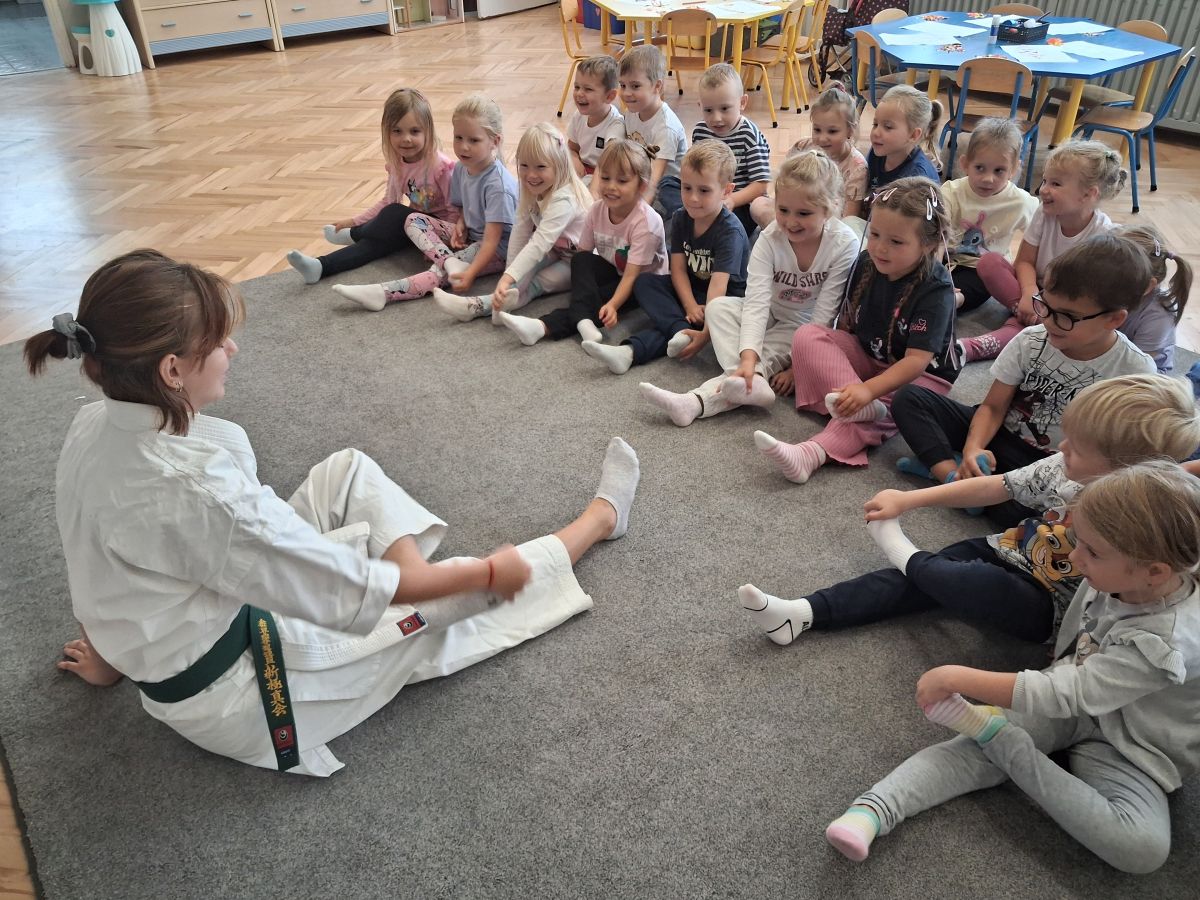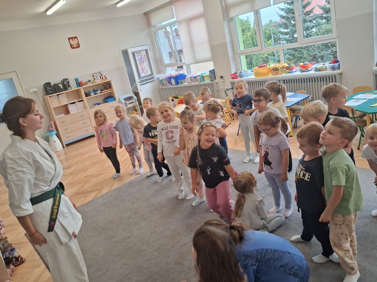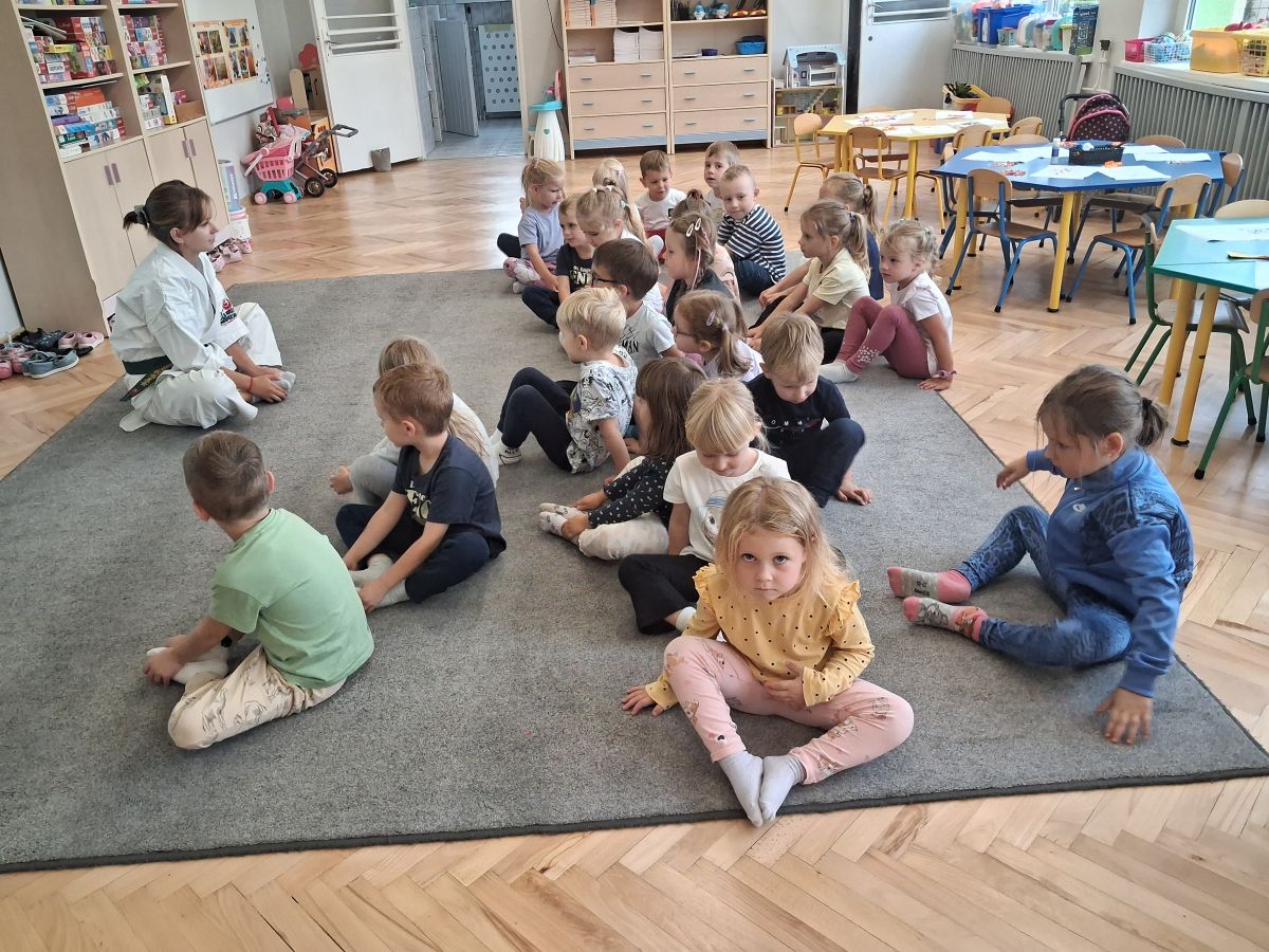 Dzisiaj naszą grupę odwiedziła Wiktoria – siostra Jasia, która trenuje karate i poprowadziła dla dzieci wyjątkowe zajęcia. Spotkanie rozpoczęło się krótką rozgrzewką, a następnie przedszkolaki wzięły udział w zabawach rozwijających koordynację, równowagę, dyscyplinę i koncentrację.