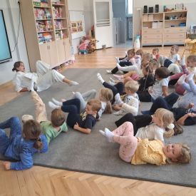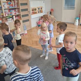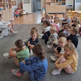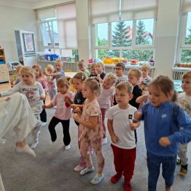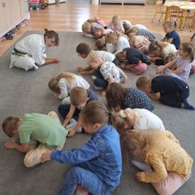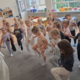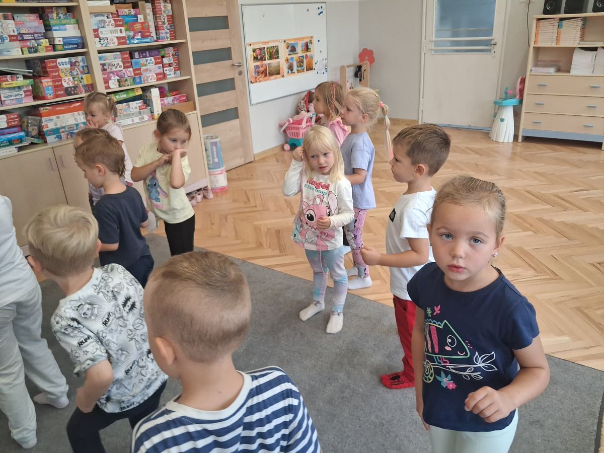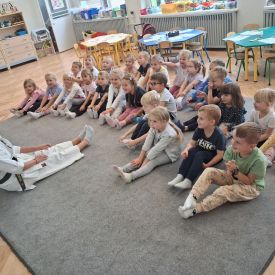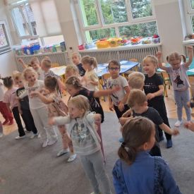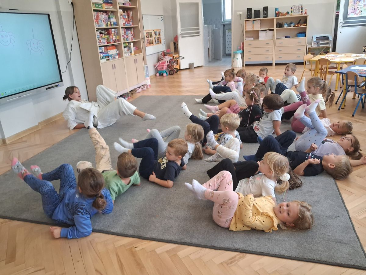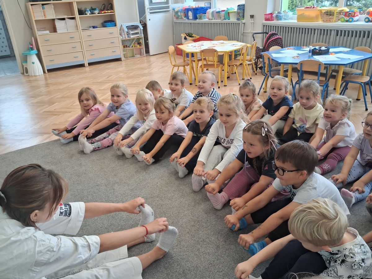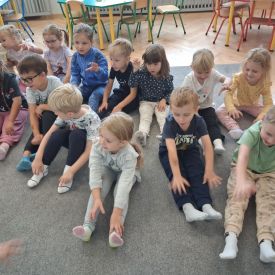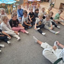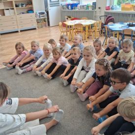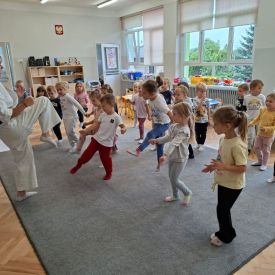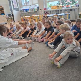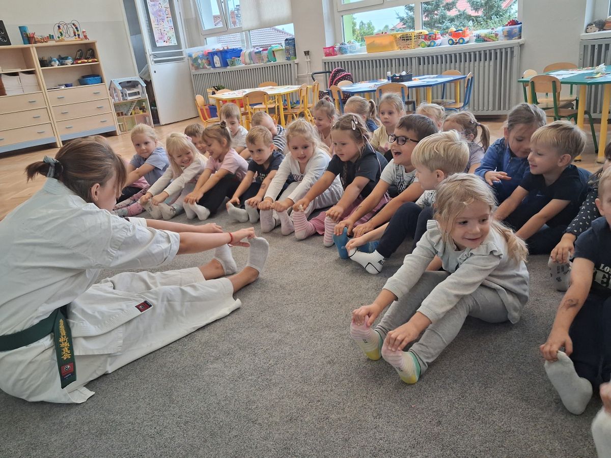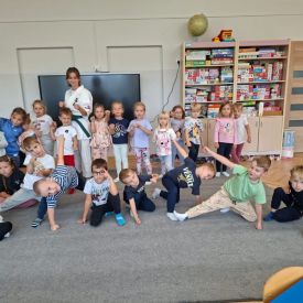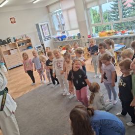 Dzisiaj naszą grupę odwiedziła Wiktoria – siostra Jasia, która trenuje karate i poprowadziła dla dzieci wyjątkowe zajęcia. Spotkanie rozpoczęło się krótką rozgrzewką, a następnie przedszkolaki wzięły udział w zabawach rozwijających koordynację, równowagę, dyscyplinę i koncentrację.