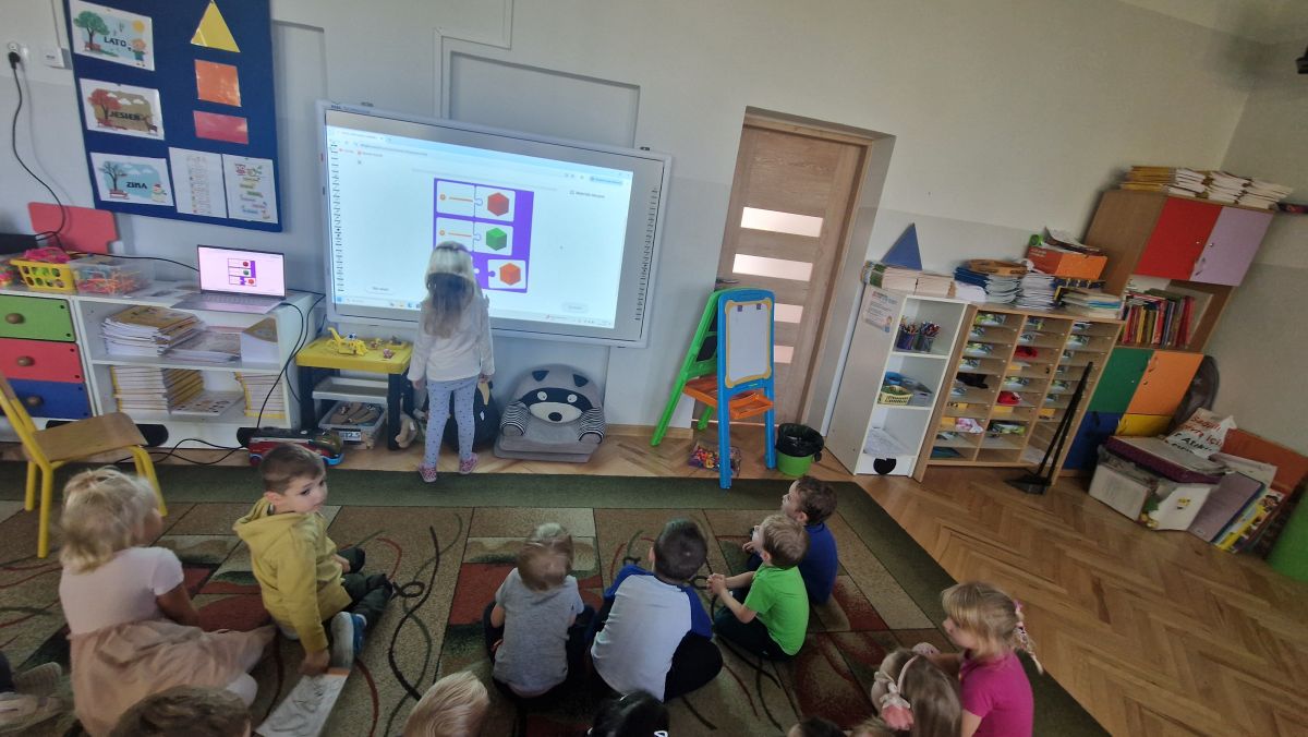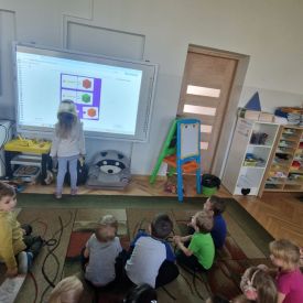 W grupie Misie odbyły się zajęcia z języka angielskiego w nietypowy sposób. Dzieci rozwiązywały zadania za pośrednictwem technologii informacyjno-komunikacyjnej z wykorzystaniem tablicy interaktywnej, dzięki czemu mogły samodzielnie dopasowywać usłyszane słowo do odpowiedniego obiektu, rozwijając w ten sposób umiejętność słuchania i rozumienia ze słuchu.