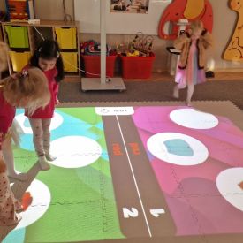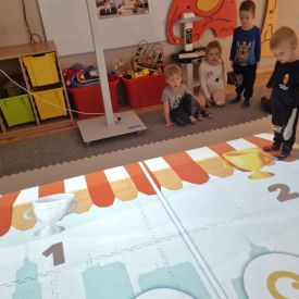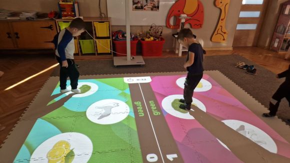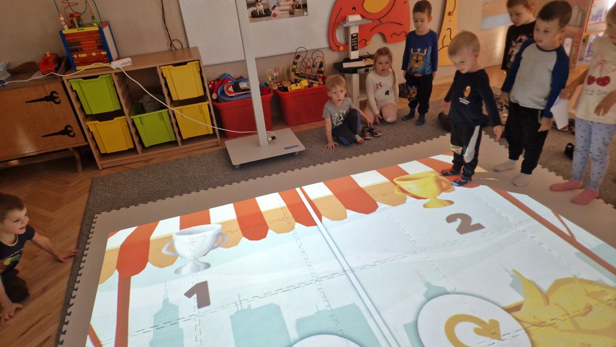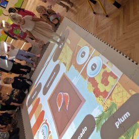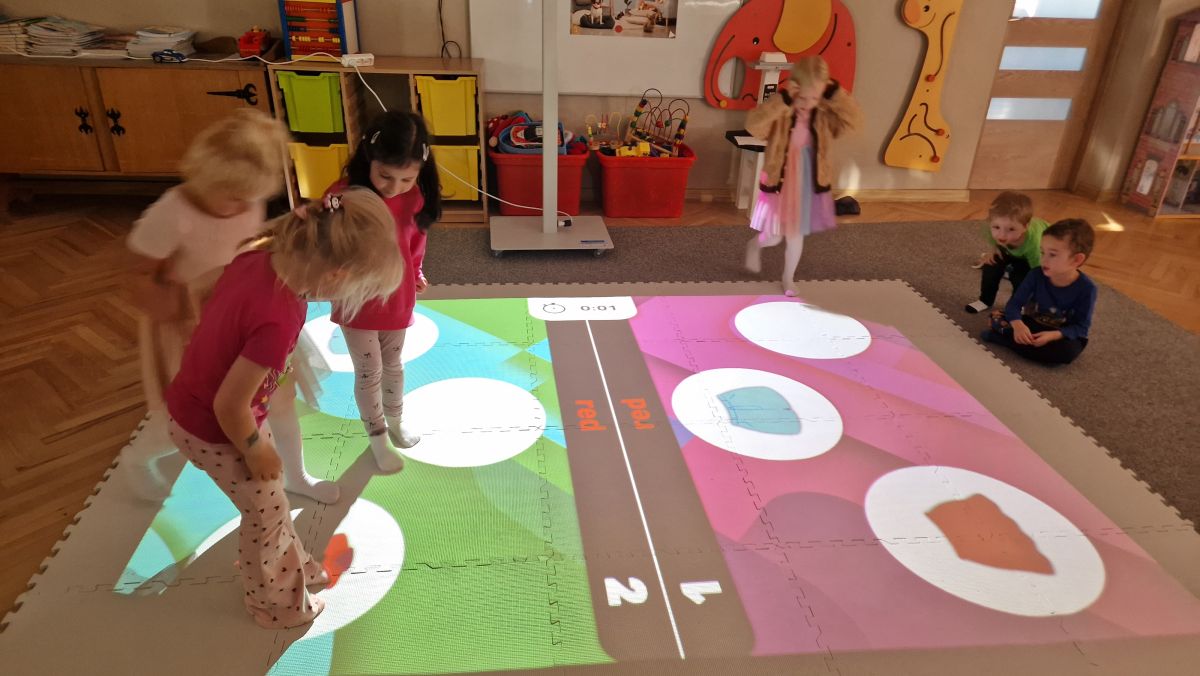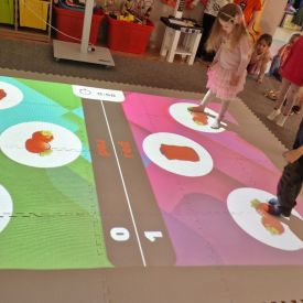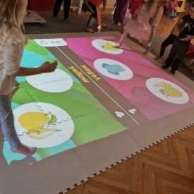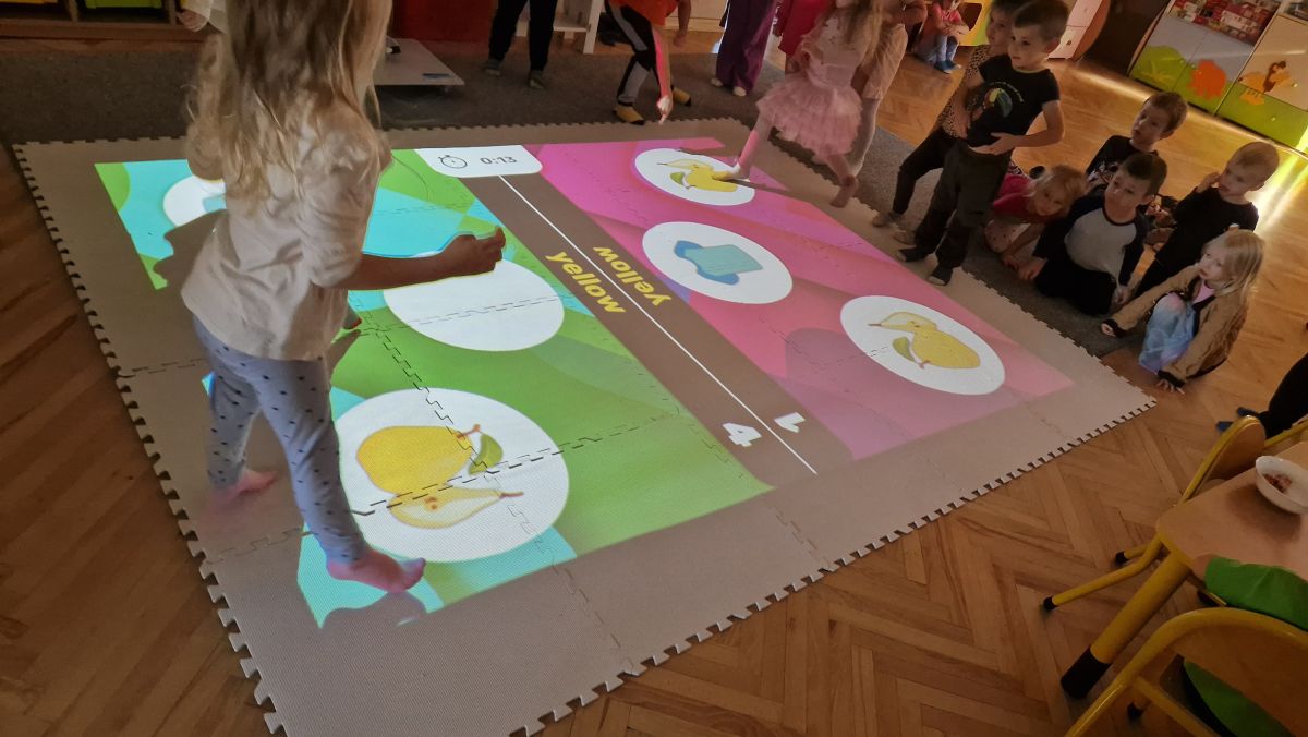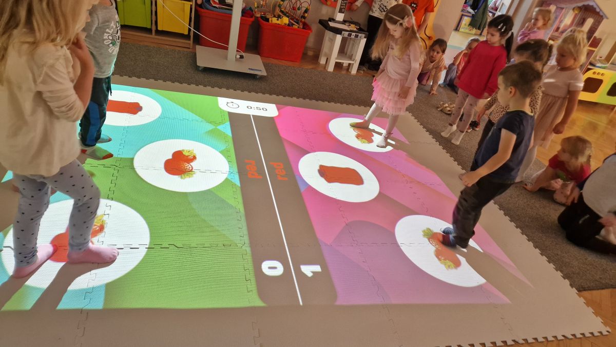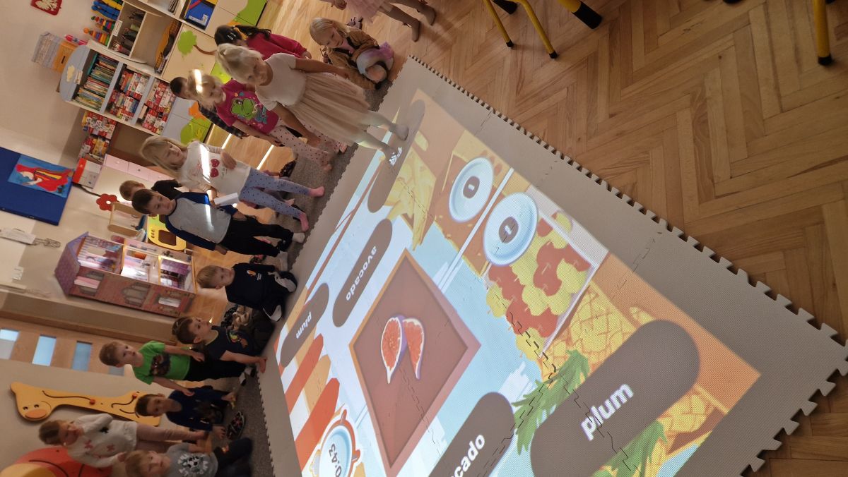 Aby urozmaicić zajęcia, dzieci bawiły się również z wykorzystaniem podłogi interaktywnej, co pozwoliło im rozwijać motorykę dużą, spostrzegawczość i refleks, a jednocześnie utrwalać znajomość kolorów i owoców w języku angielskim.