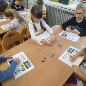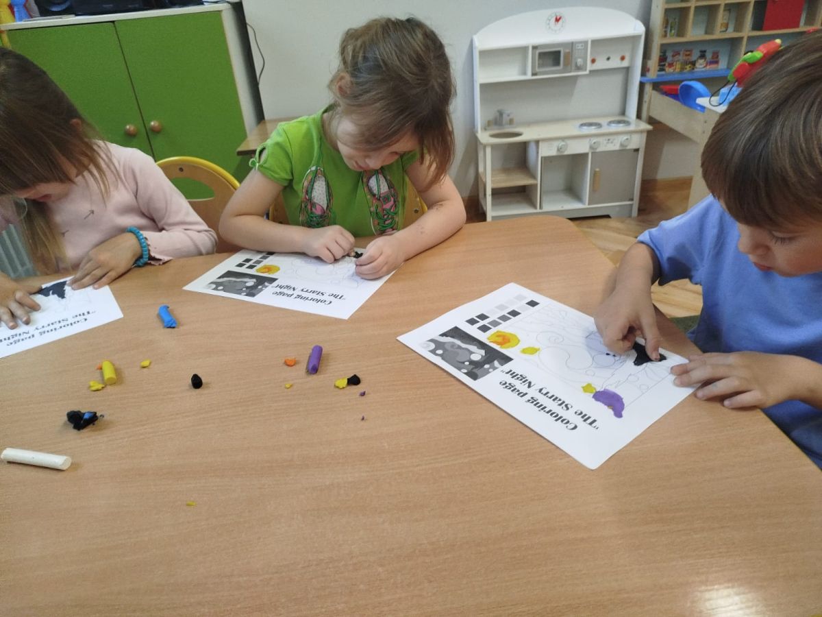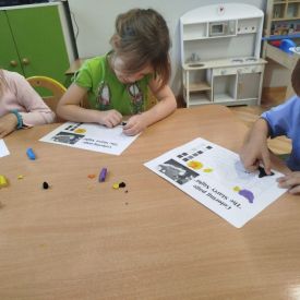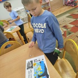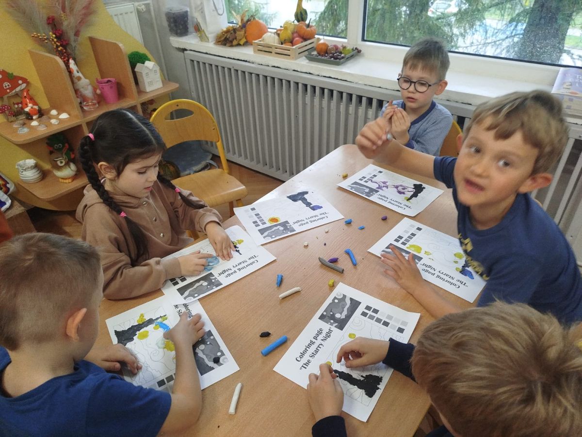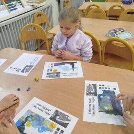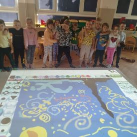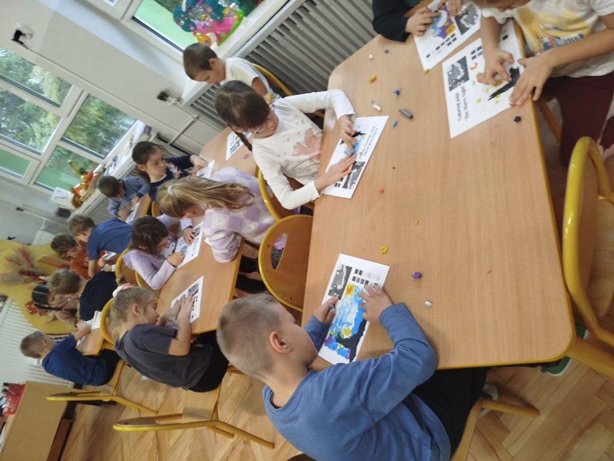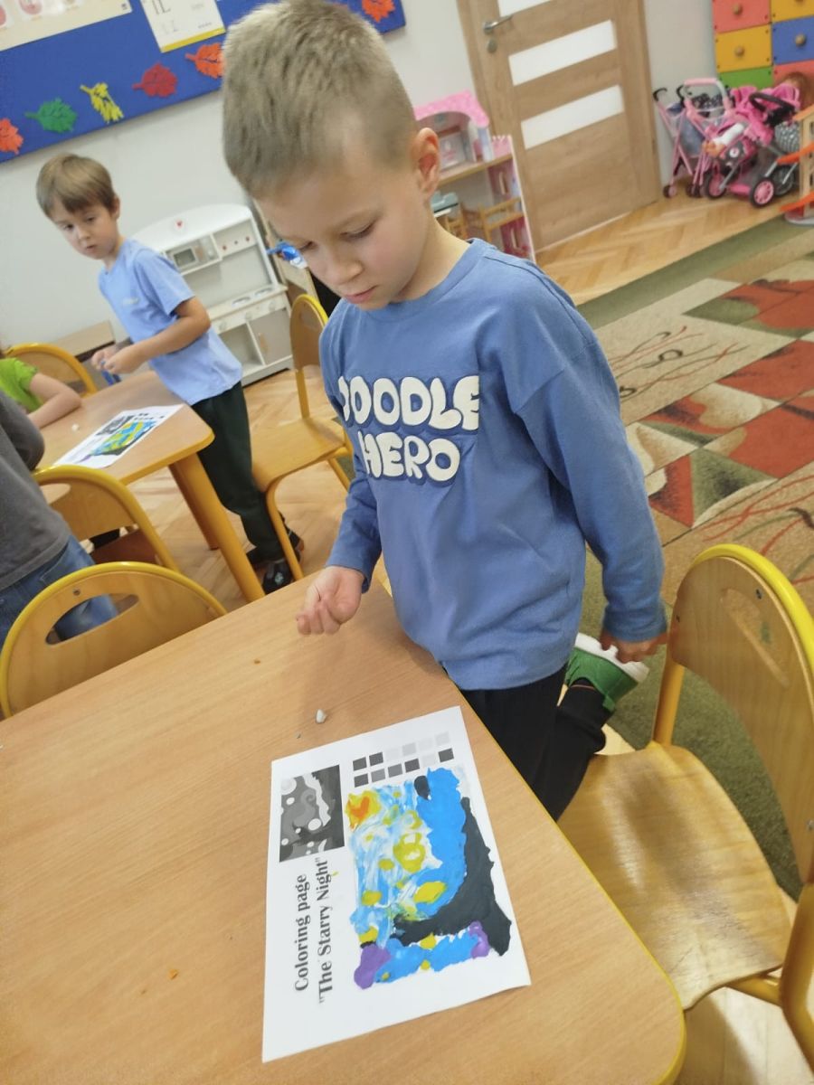 Następnego dnia dzieci przystąpiły do realizacji kolejnego zadania w ramach Ogólnopolskiego Projektu Edukacyjnego „Zabawa sztuką” – malowania plasteliną. Każde dziecko indywidualnie wykonało swoją wersję „Gwieździstej nocy”, poznając przy tym, że tworzenie wymaga cierpliwości, skupienia i pomysłowości. Efekt końcowy przyniósł przedszkolakom ogromną satysfakcję i radość.