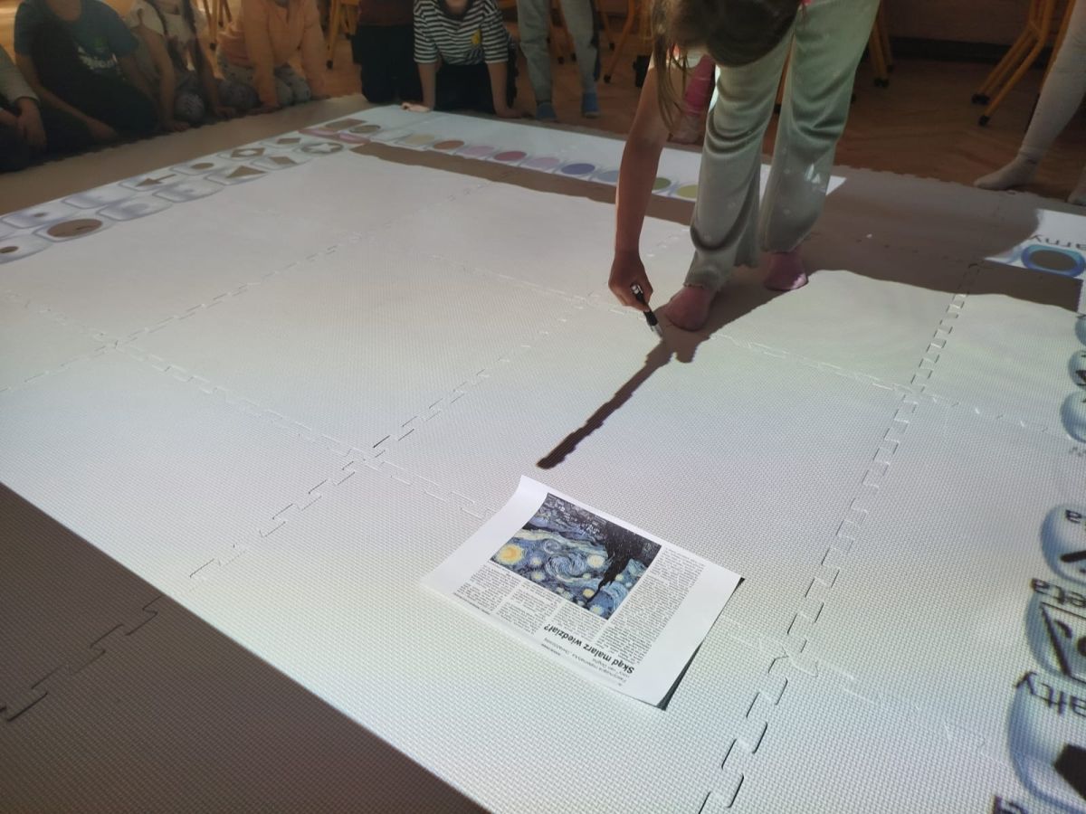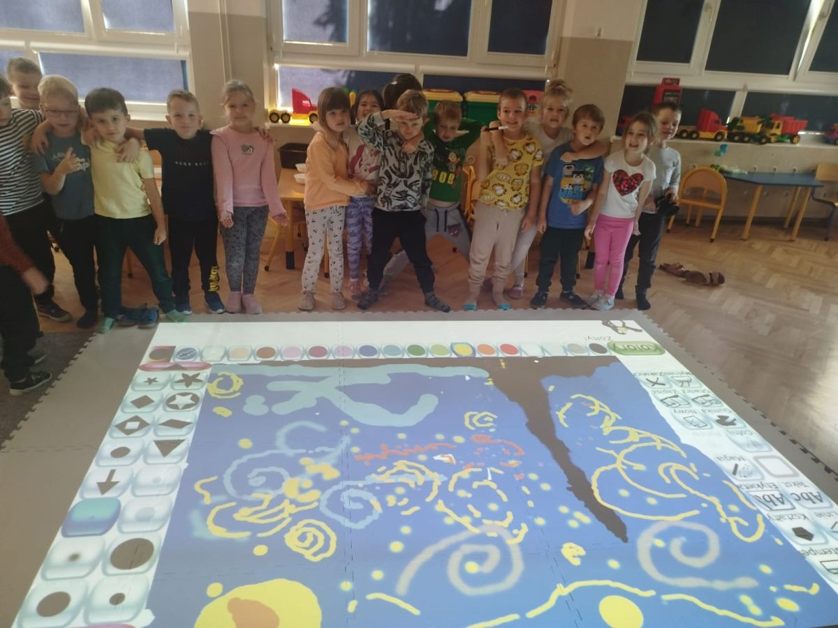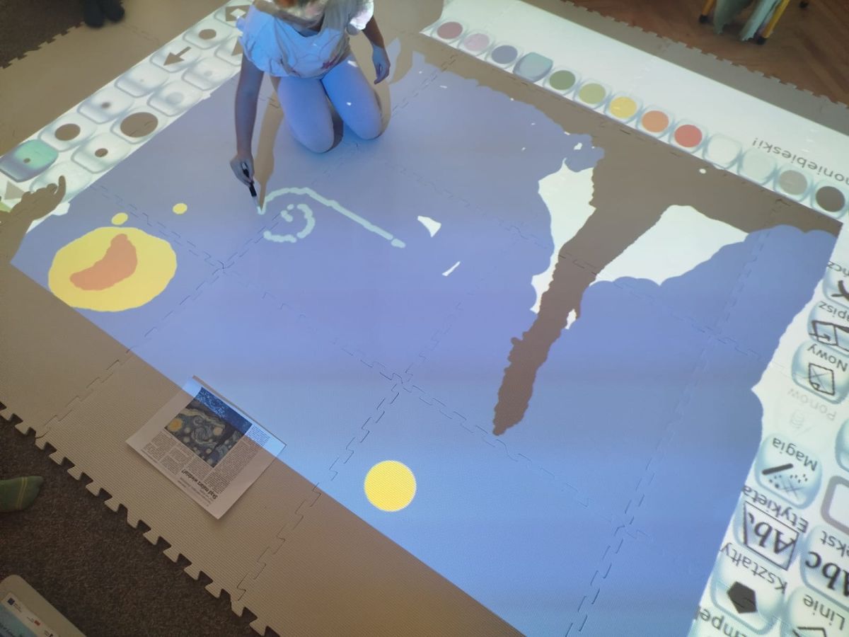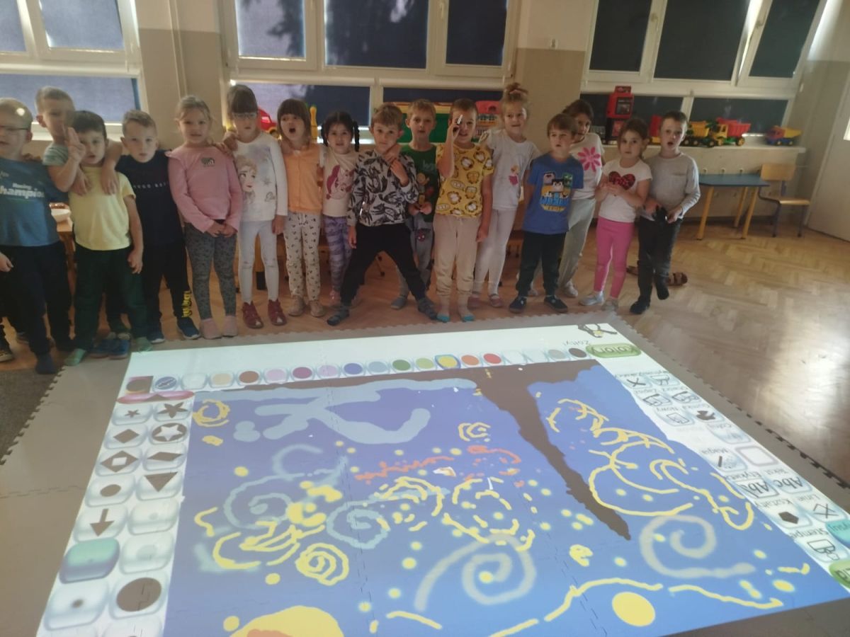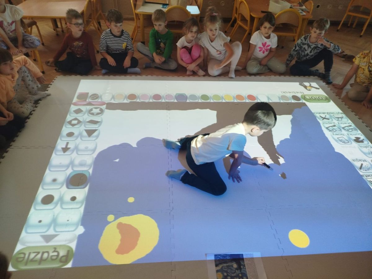 Zainspirowani twórczością Van Gogha, Krasnale przeniosły się na podłogę interaktywną, gdzie stworzyły własną wersję „Gwieździstej nocy”. Wspólna praca rozwijała współpracę rówieśniczą, logiczne i algorytmiczne myślenie, a także ekspresję twórczą.
