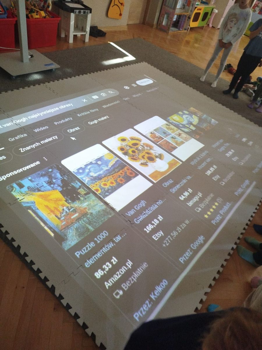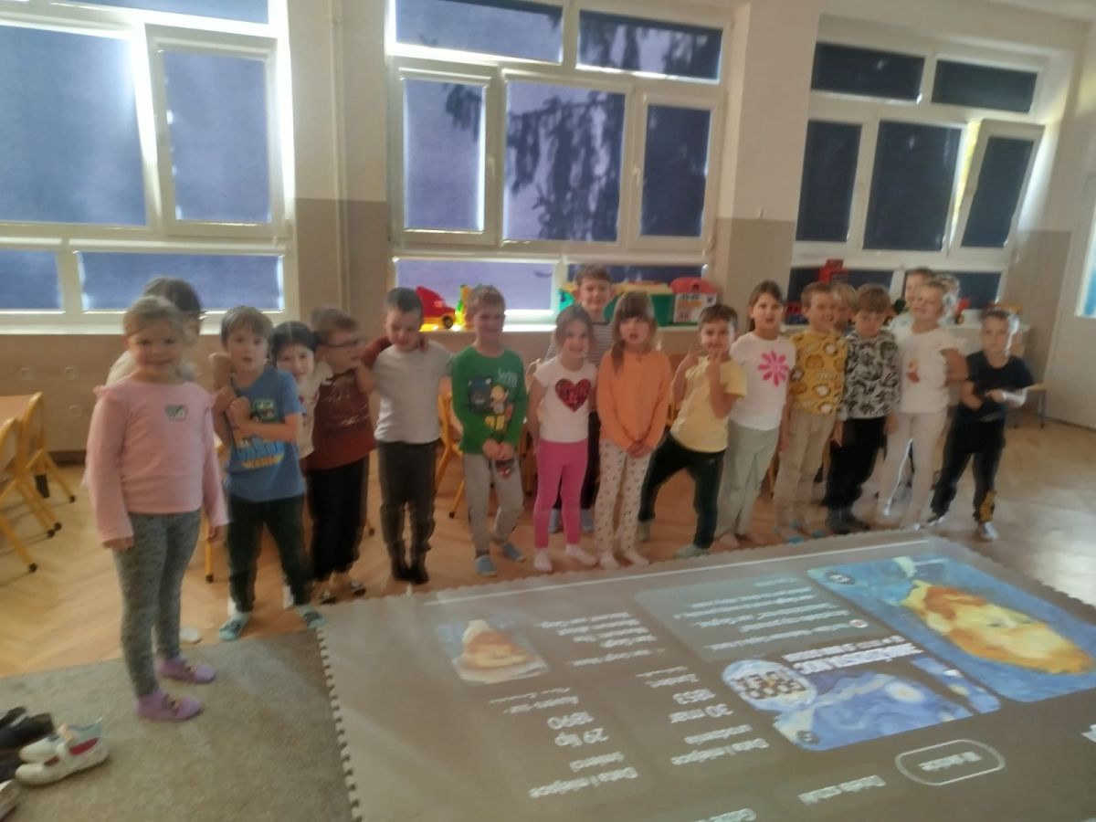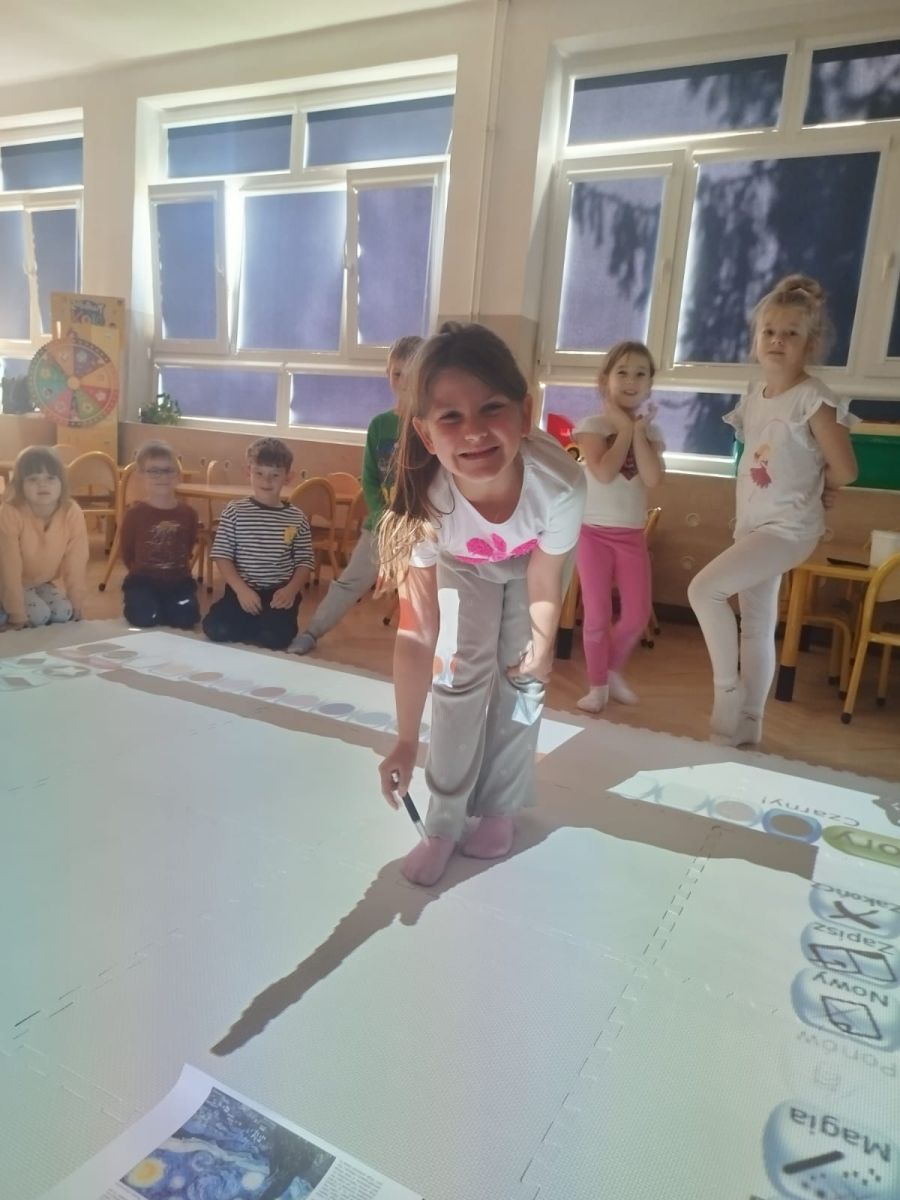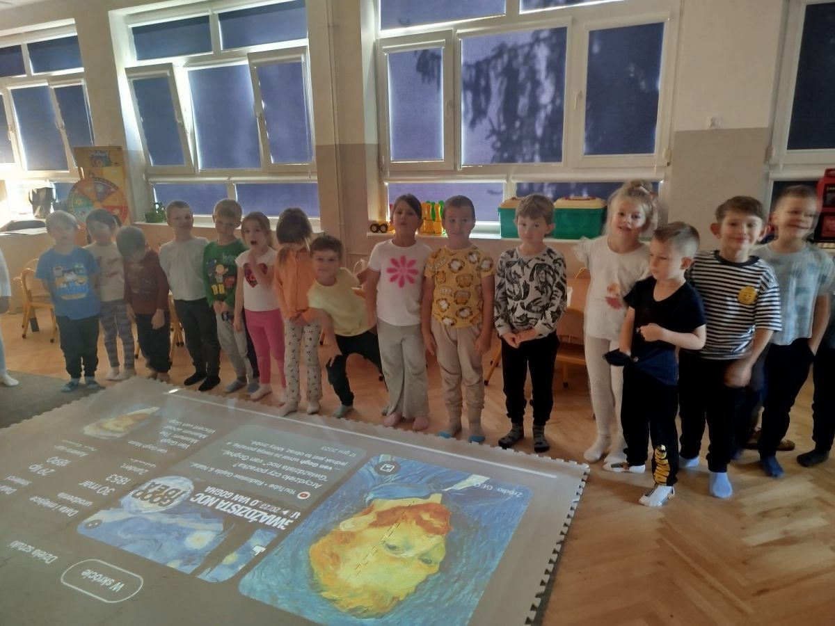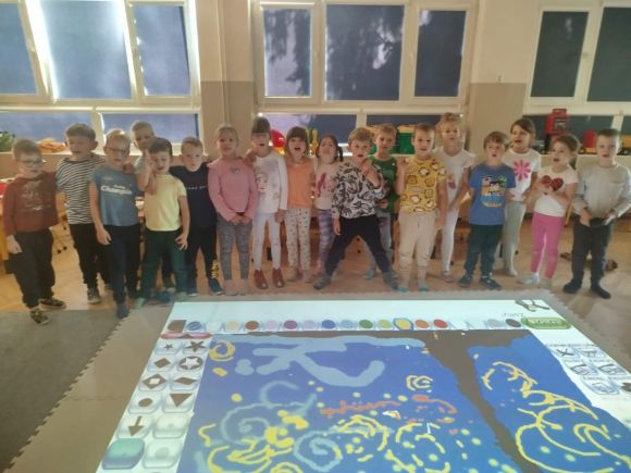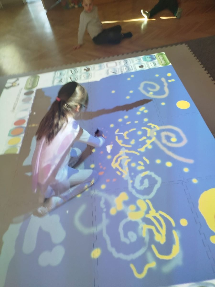 Zainspirowani twórczością Van Gogha, Krasnale przeniosły się na podłogę interaktywną, gdzie stworzyły własną wersję „Gwieździstej nocy”. Wspólna praca rozwijała współpracę rówieśniczą, logiczne i algorytmiczne myślenie, a także ekspresję twórczą.