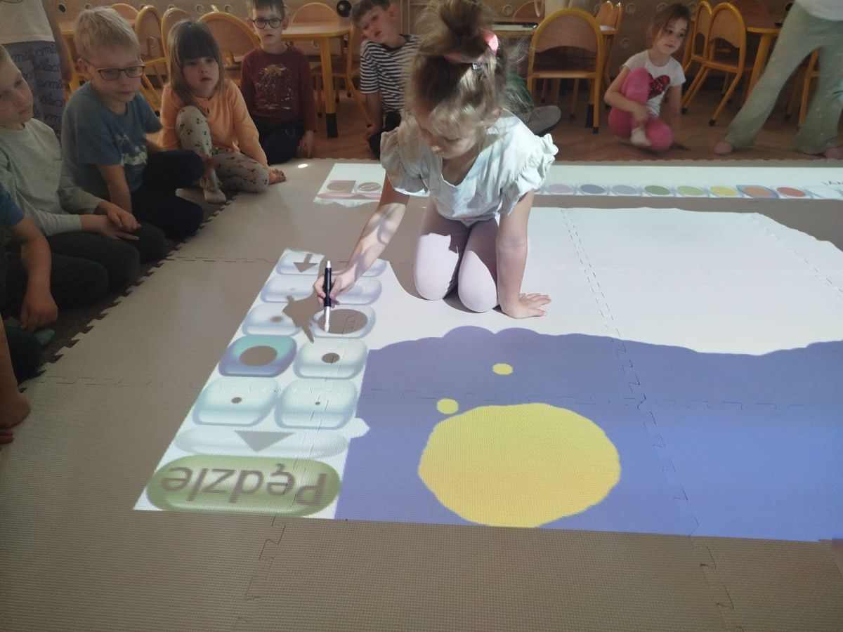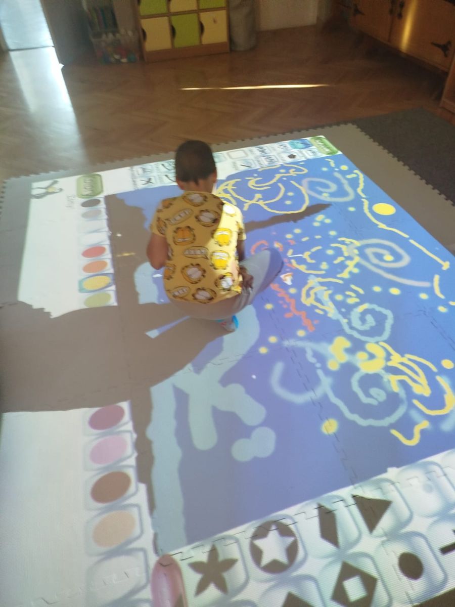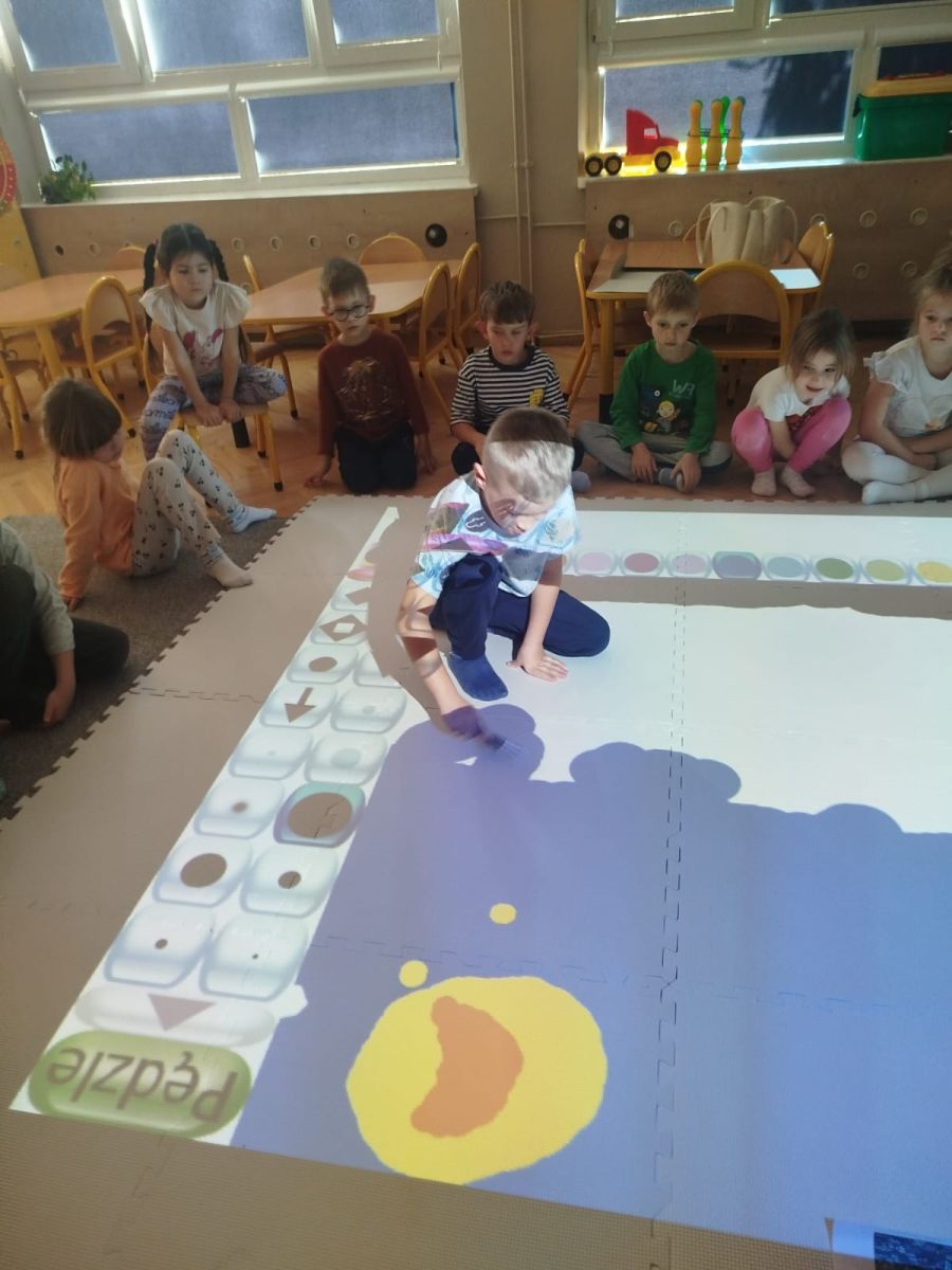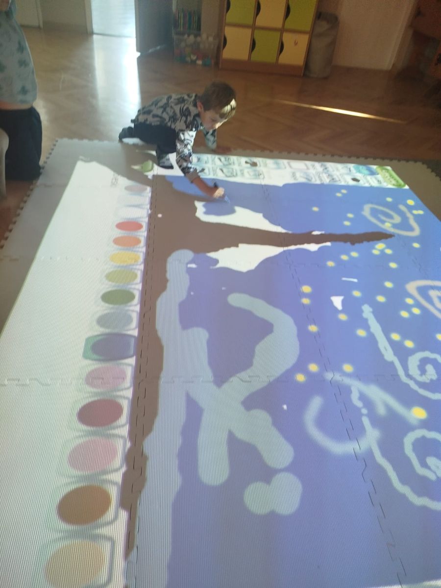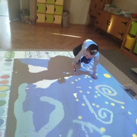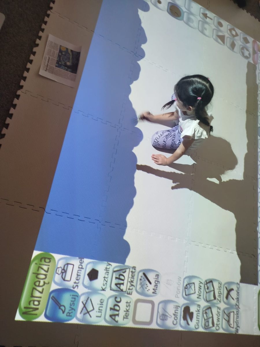 Zainspirowani twórczością Van Gogha, Krasnale przeniosły się na podłogę interaktywną, gdzie stworzyły własną wersję „Gwieździstej nocy”. Wspólna praca rozwijała współpracę rówieśniczą, logiczne i algorytmiczne myślenie, a także ekspresję twórczą.