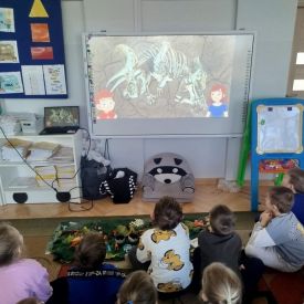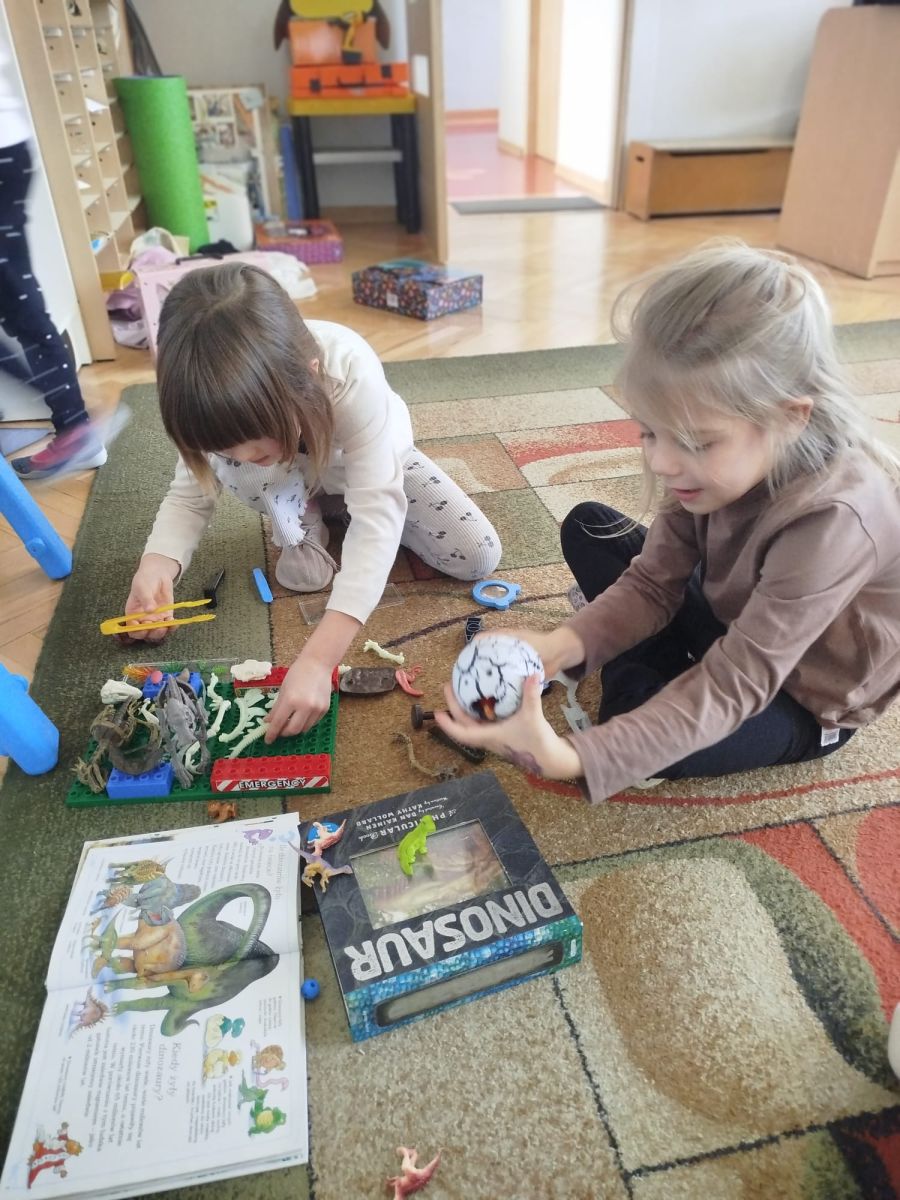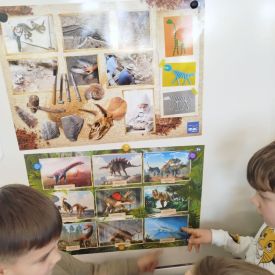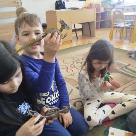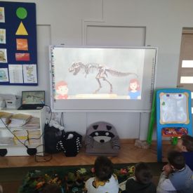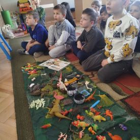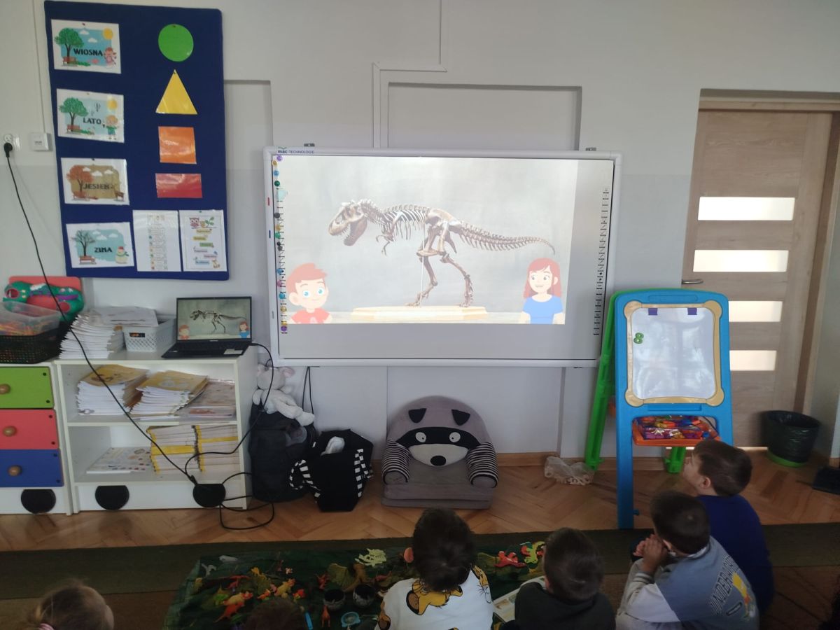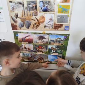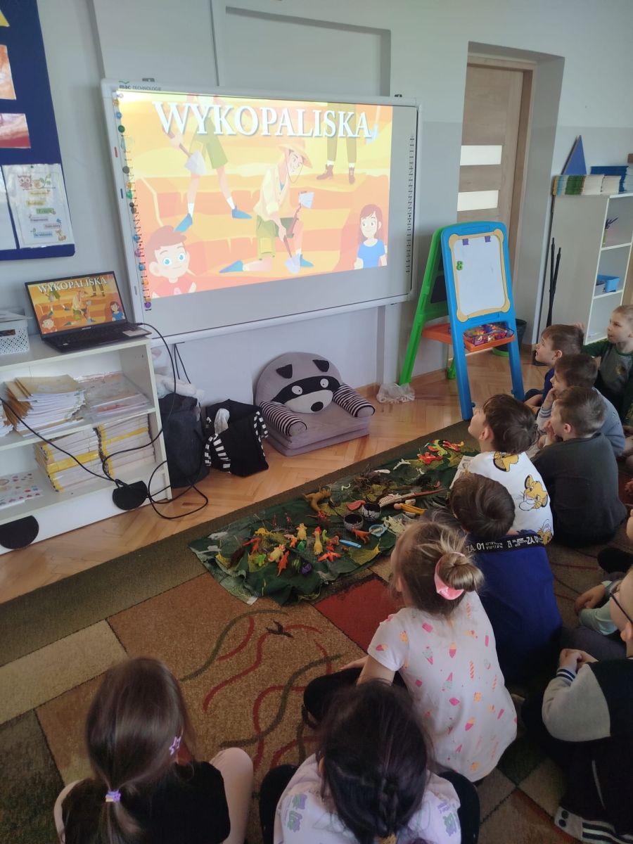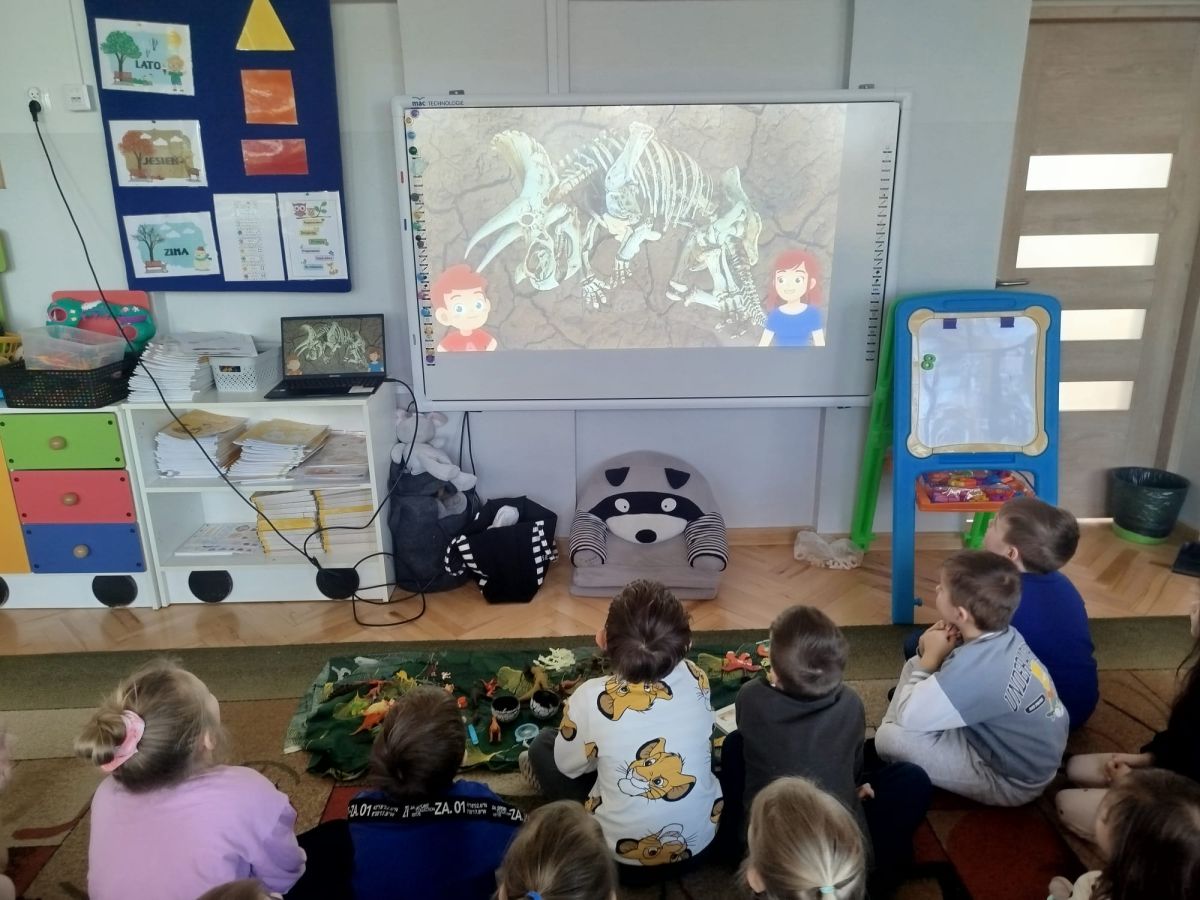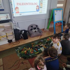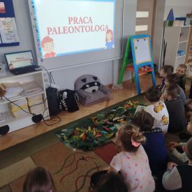 Obejrzeliśmy edukacyjny film dla dzieci „Kim jest paleontolog?”, z którego dowiedzieliśmy się, jakich narzędzi używa badacz (m.in. pędzelków, małych łopatek czy specjalnych dłutek) oraz jak wygląda jego dzień pracy. Poznaliśmy wiele ciekawostek o dinozaurach – dowiedzieliśmy się, które były roślinożerne, które mięsożerne oraz jak wielkie potrafiły być niektóre z nich.