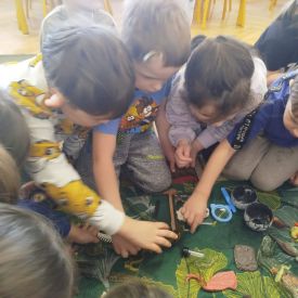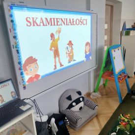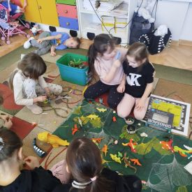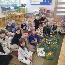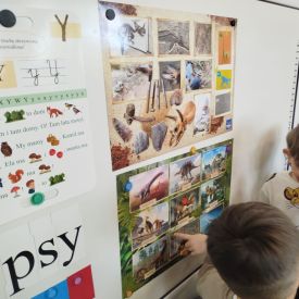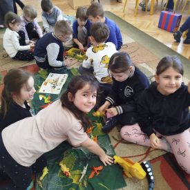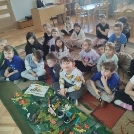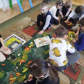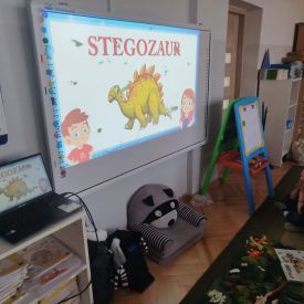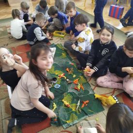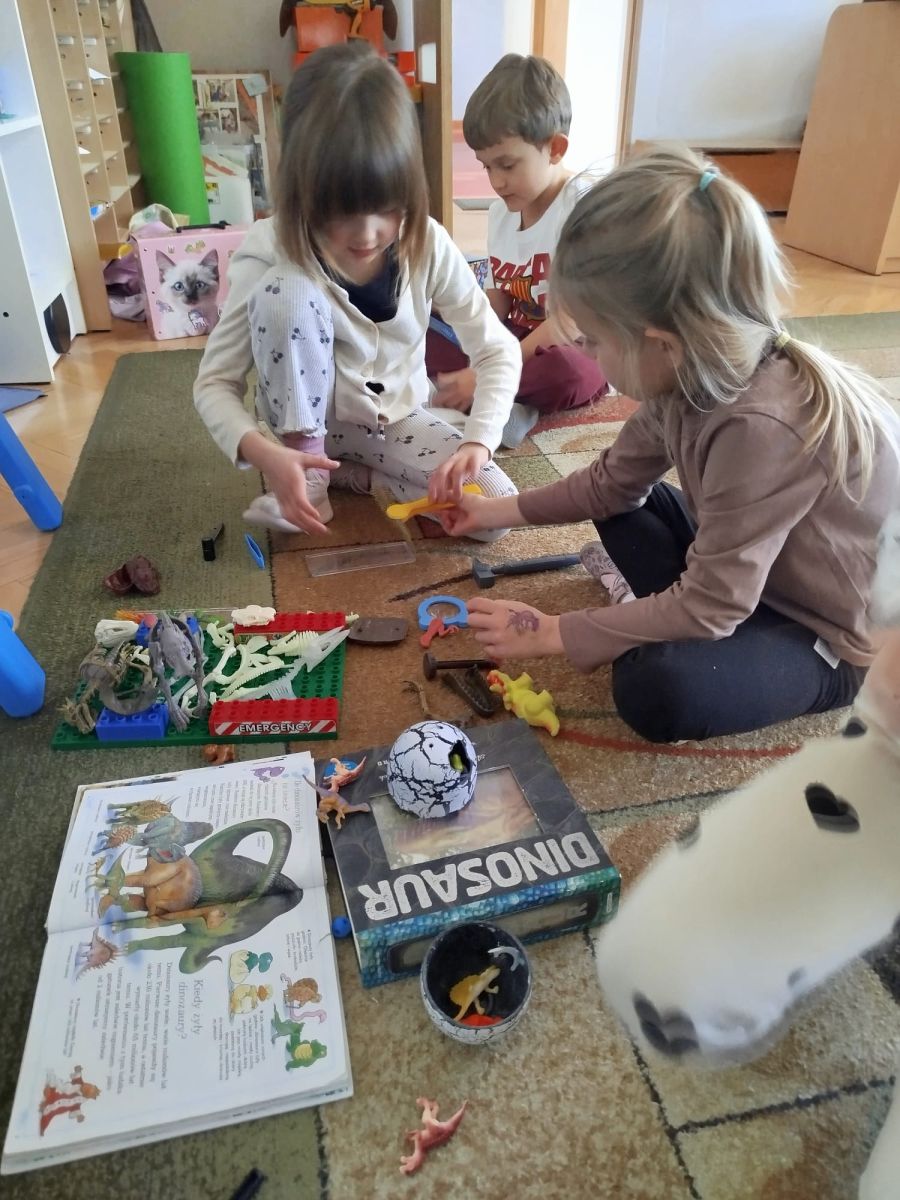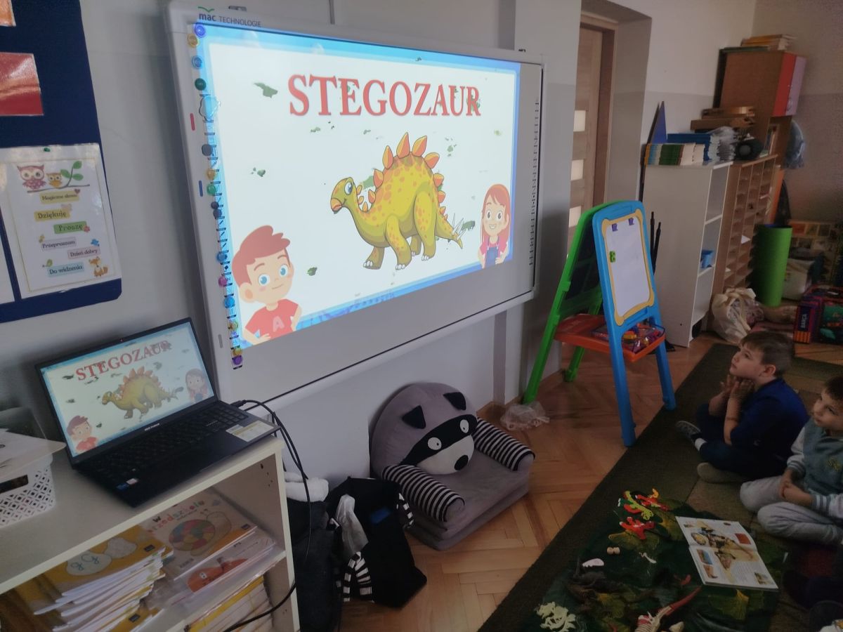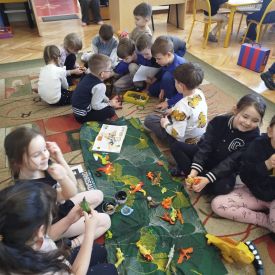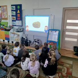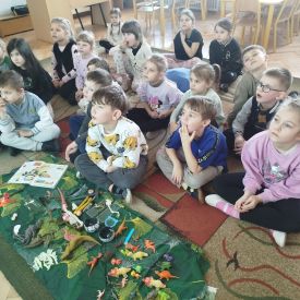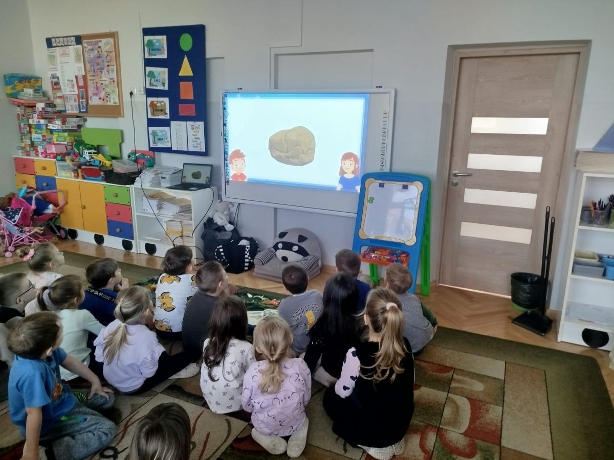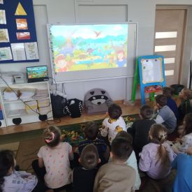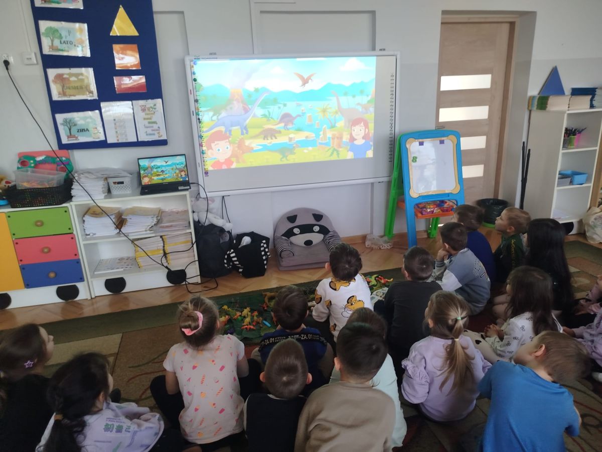 Obejrzeliśmy edukacyjny film dla dzieci „Kim jest paleontolog?”, z którego dowiedzieliśmy się, jakich narzędzi używa badacz (m.in. pędzelków, małych łopatek czy specjalnych dłutek) oraz jak wygląda jego dzień pracy. Poznaliśmy wiele ciekawostek o dinozaurach – dowiedzieliśmy się, które były roślinożerne, które mięsożerne oraz jak wielkie potrafiły być niektóre z nich.