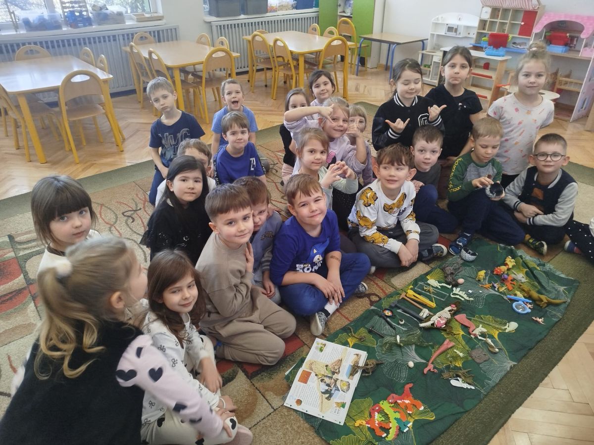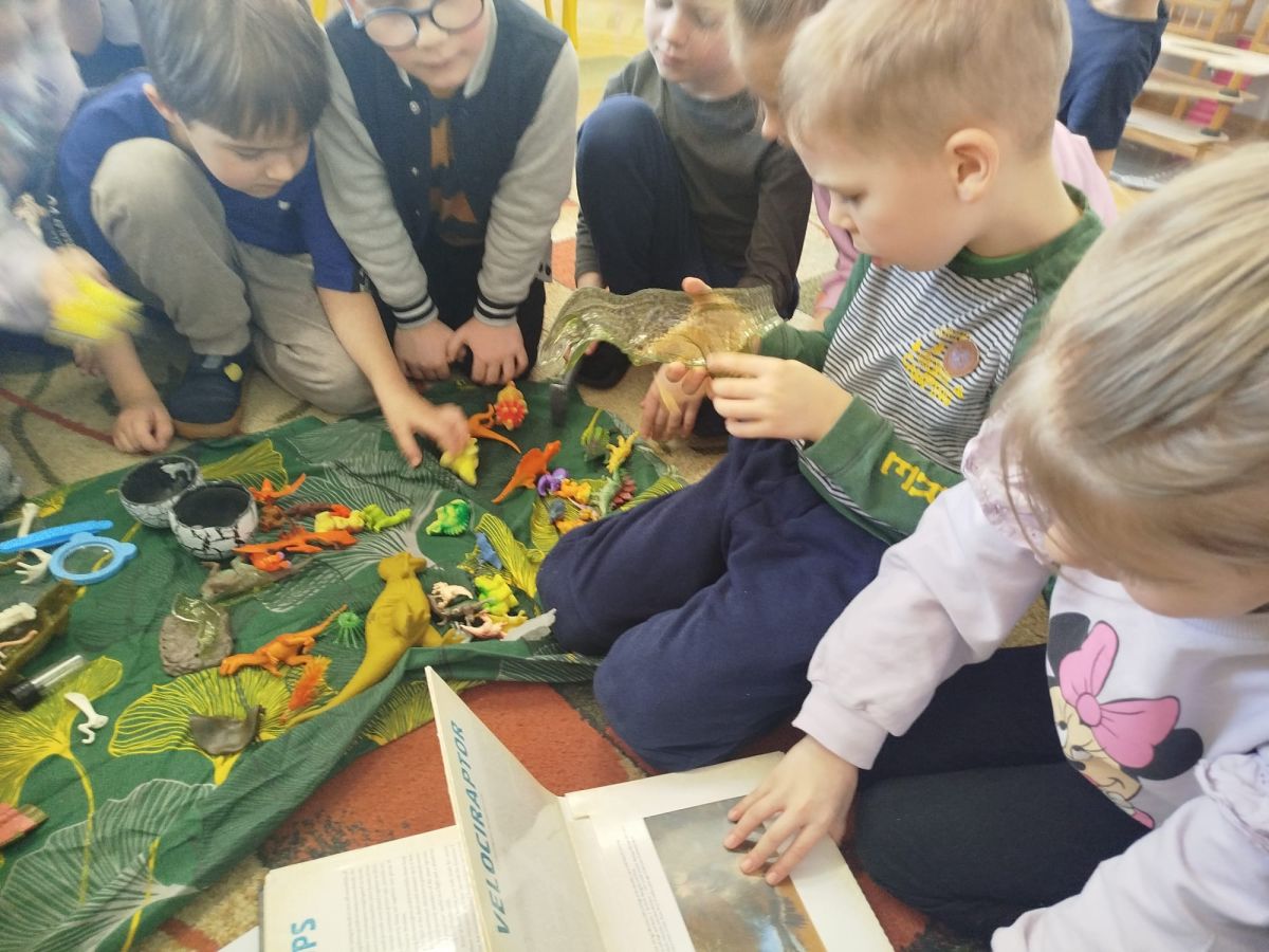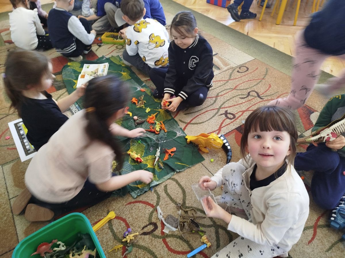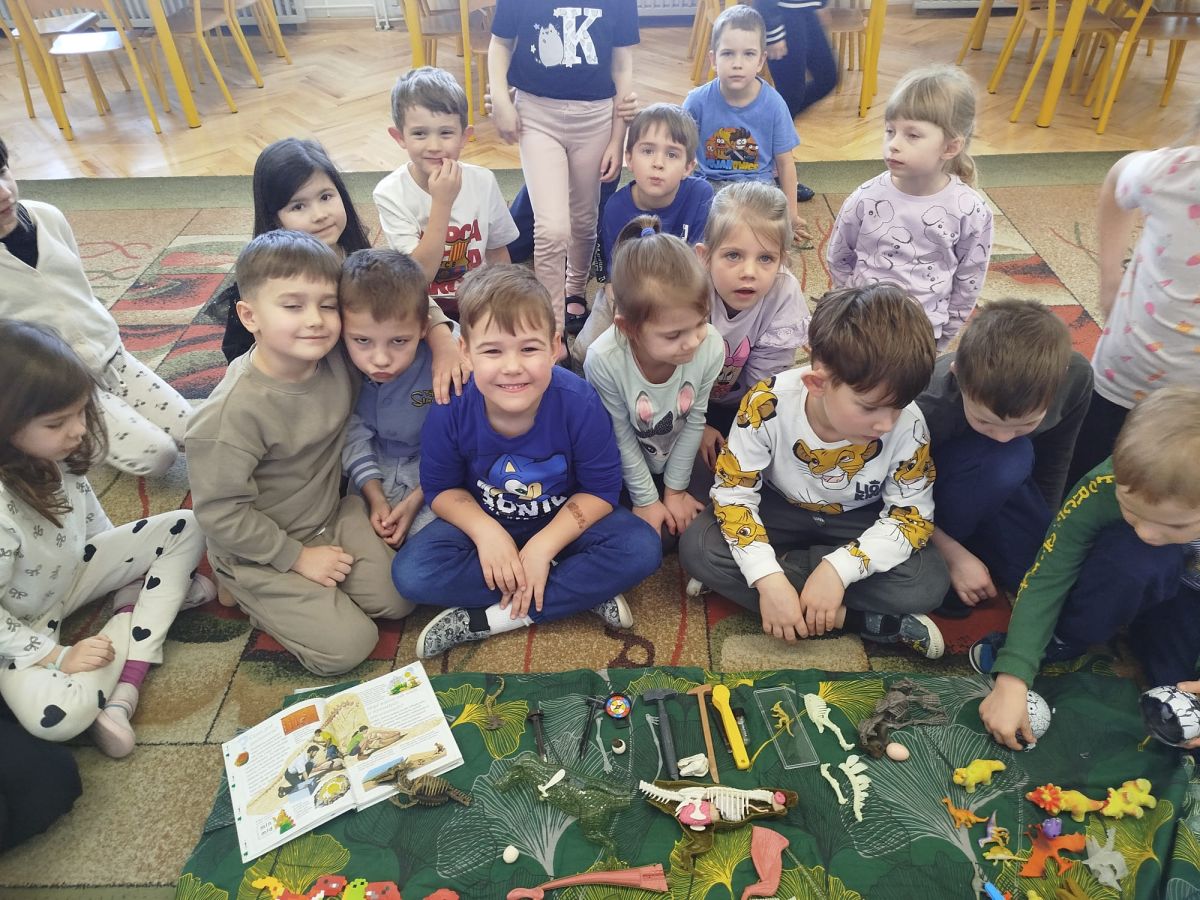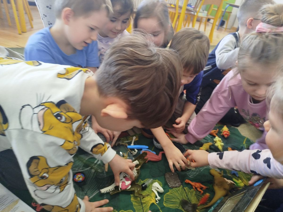 W tym tygodniu w naszej sali zrobiło się jak w prawdziwym muzeum historii naturalnej! Dzieci z grupy Krasnale wyruszyły w niezwykłą podróż do świata dinozaurów i prehistorycznych odkryć. Tematem naszych zajęć było: „Poznajemy pracę paleontologa i dzieje dinozaurów”.