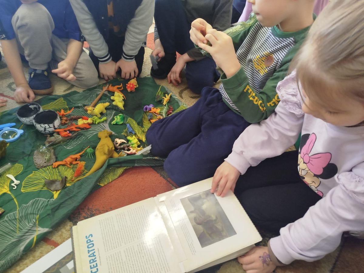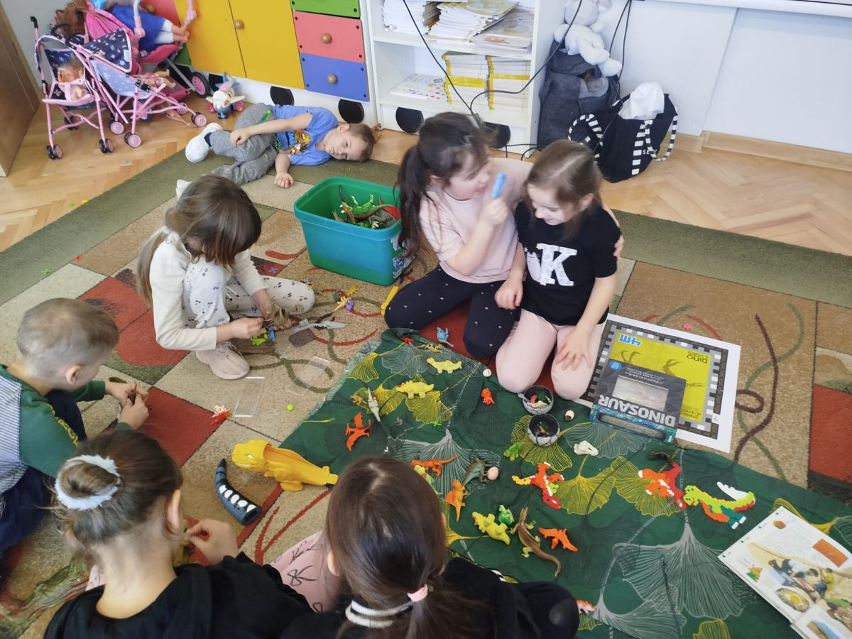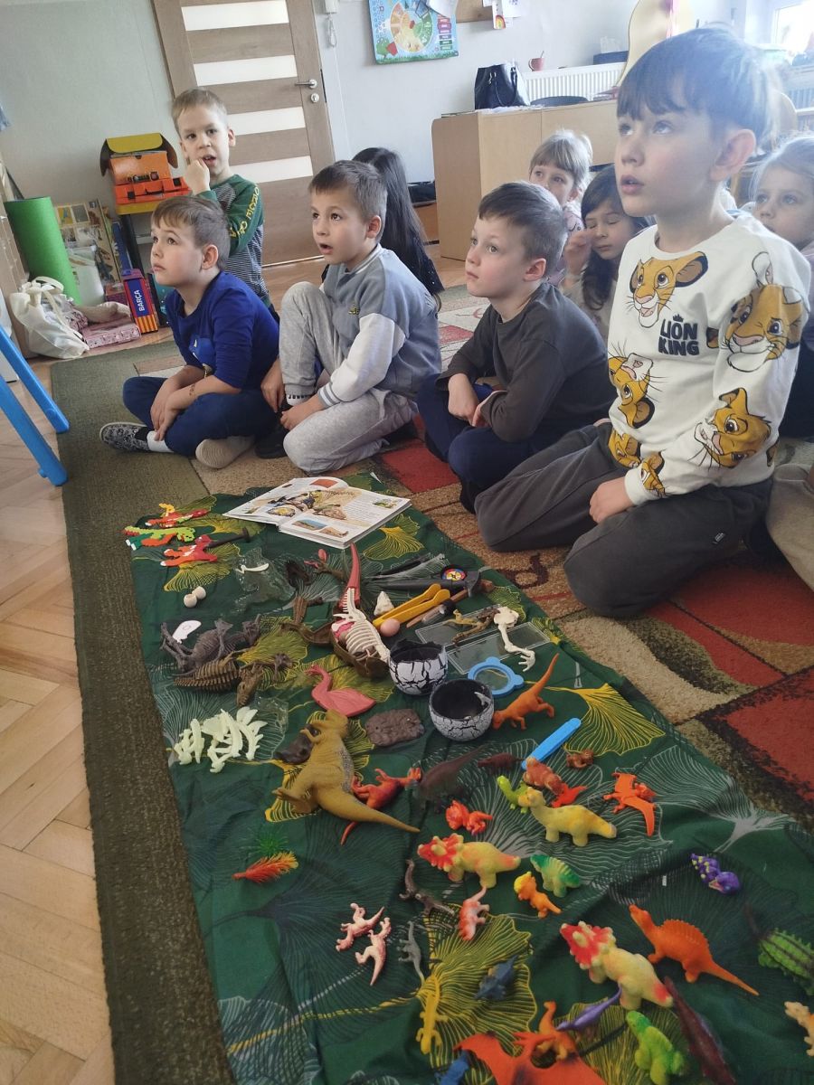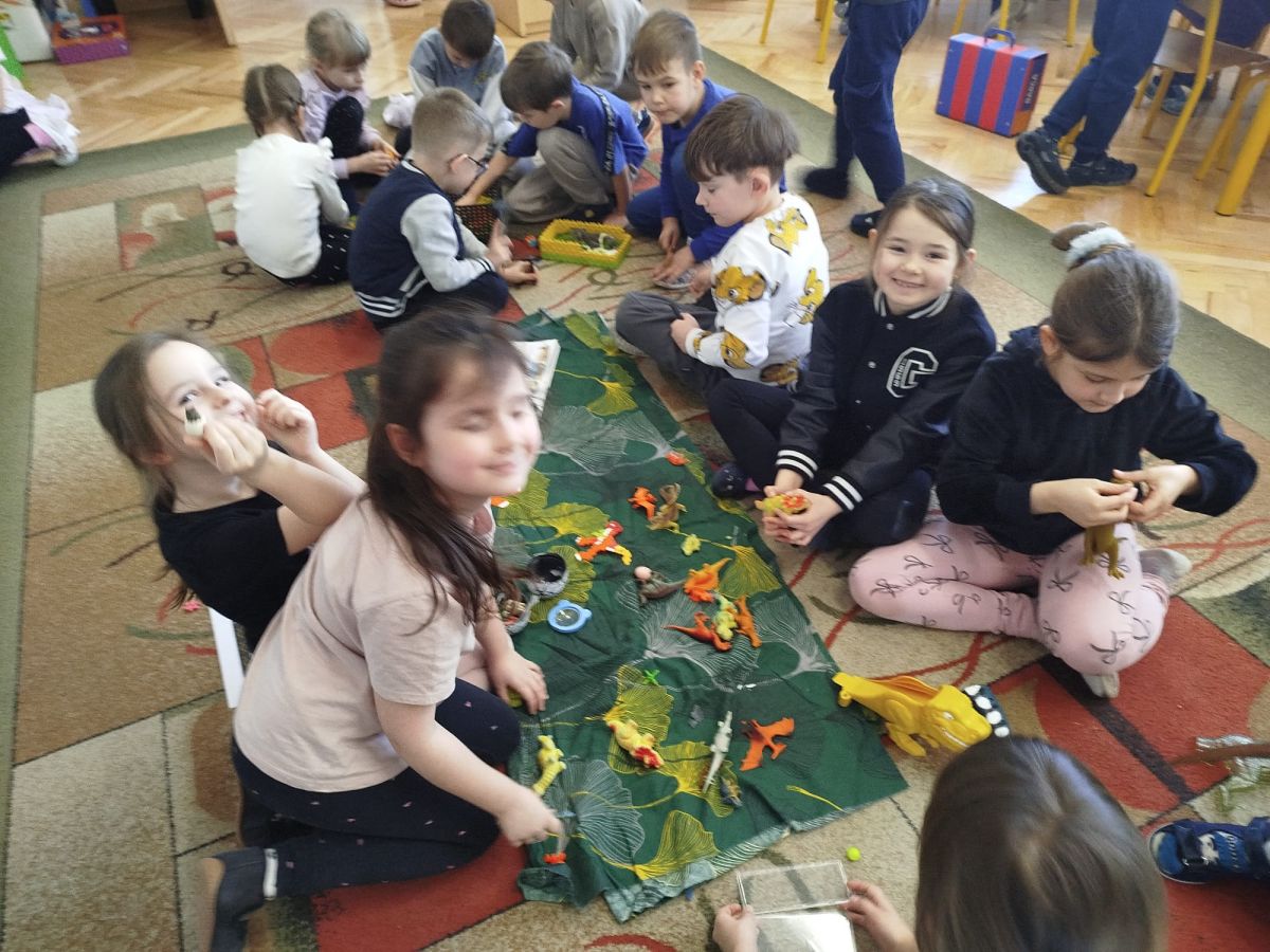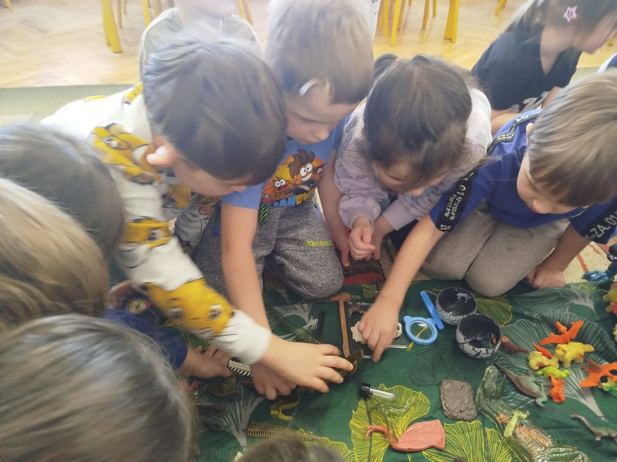 W tym tygodniu w naszej sali zrobiło się jak w prawdziwym muzeum historii naturalnej! Dzieci z grupy Krasnale wyruszyły w niezwykłą podróż do świata dinozaurów i prehistorycznych odkryć. Tematem naszych zajęć było: „Poznajemy pracę paleontologa i dzieje dinozaurów”.