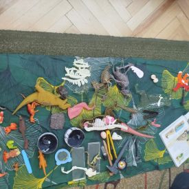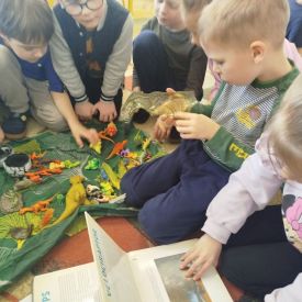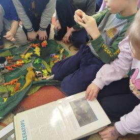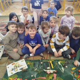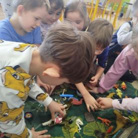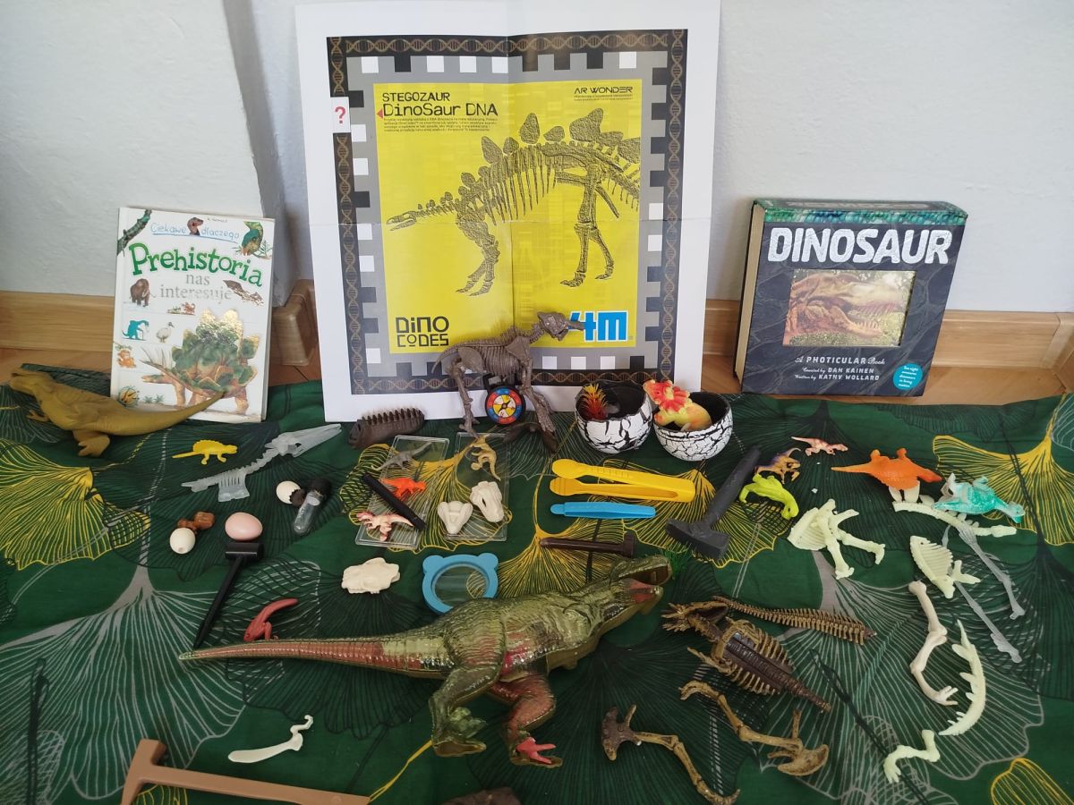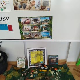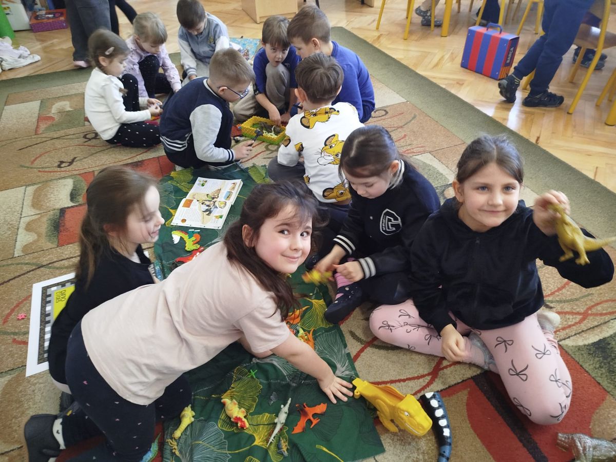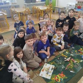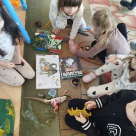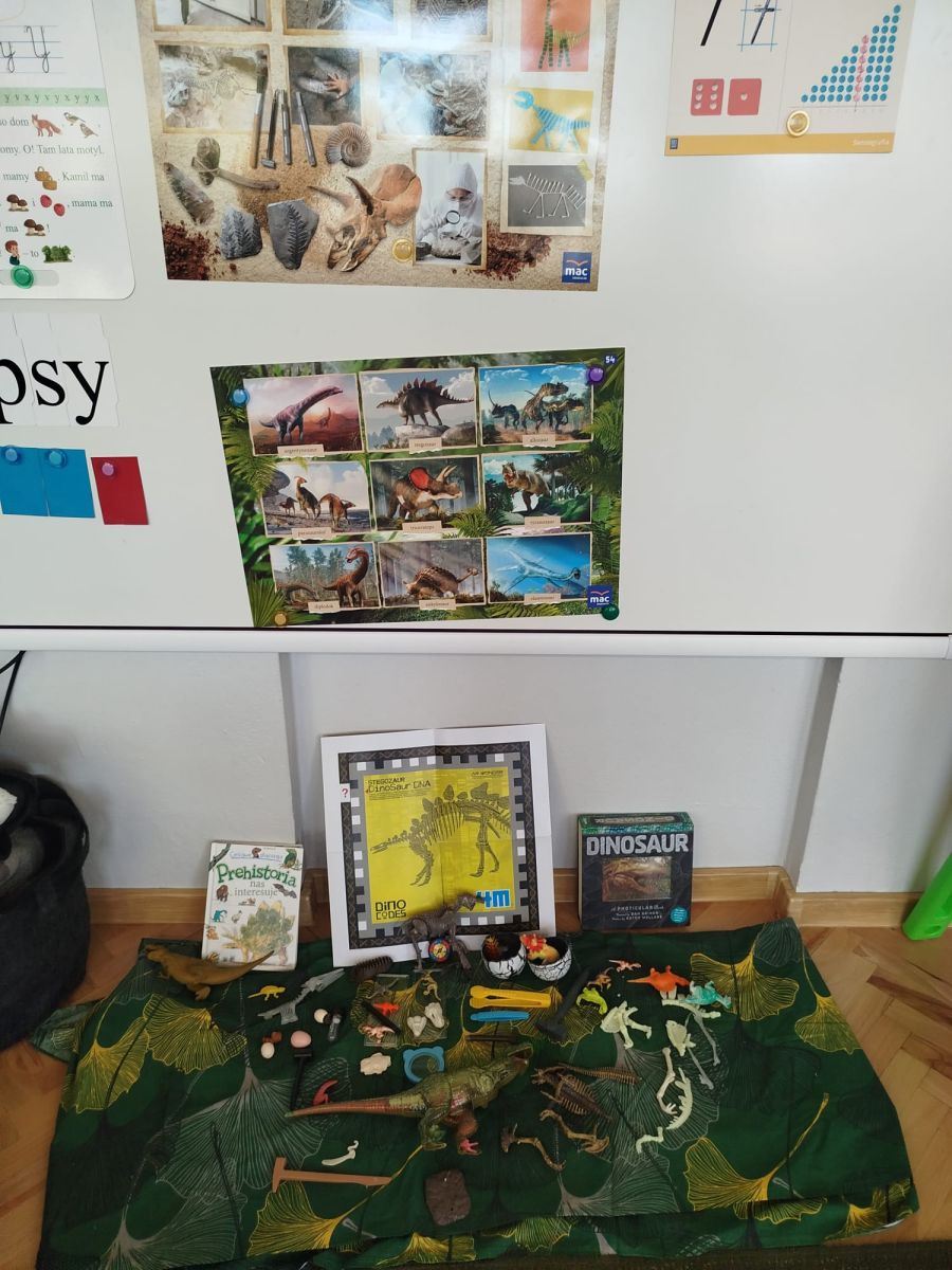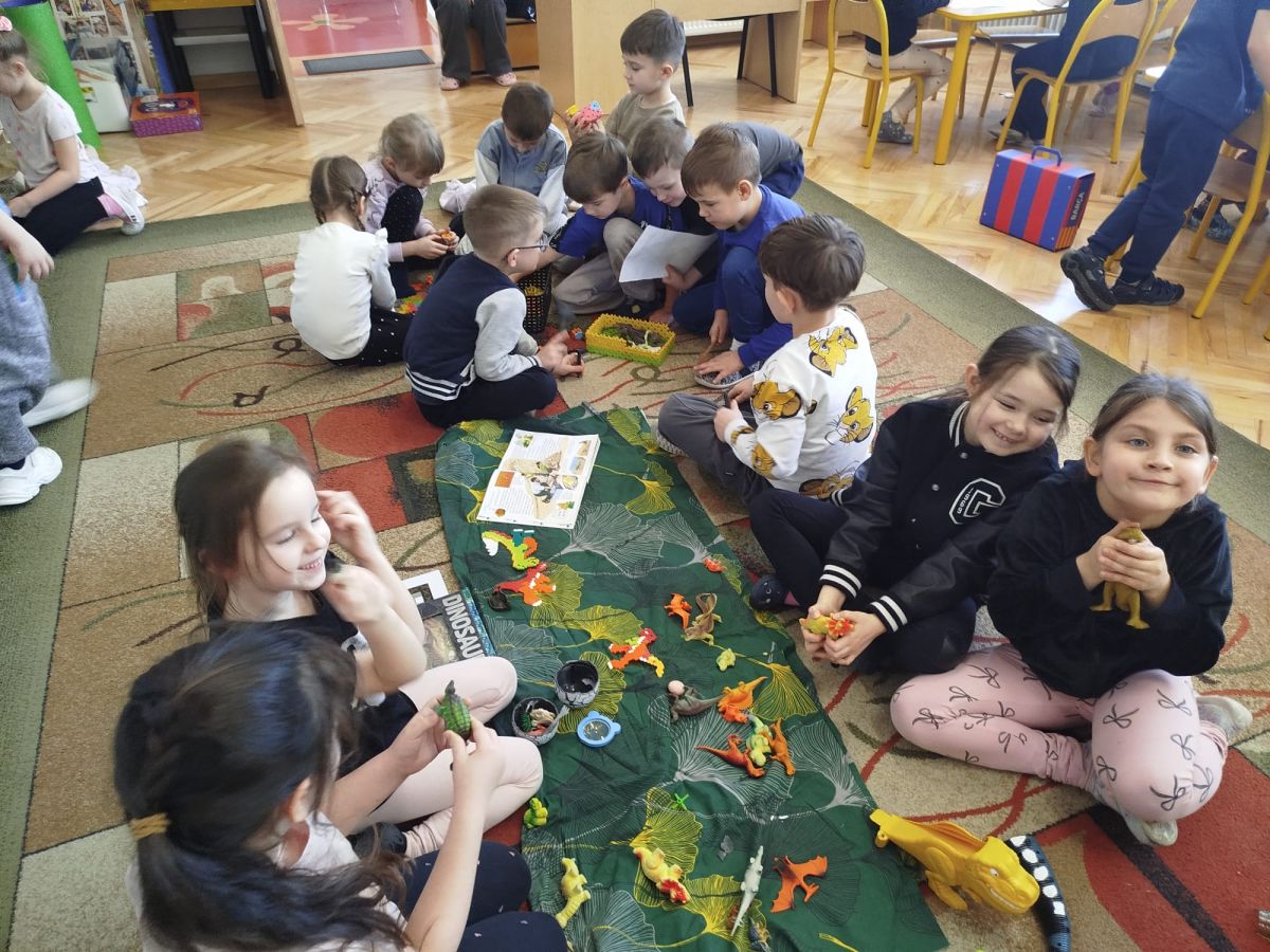 W tym tygodniu w naszej sali zrobiło się jak w prawdziwym muzeum historii naturalnej! Dzieci z grupy Krasnale wyruszyły w niezwykłą podróż do świata dinozaurów i prehistorycznych odkryć. Tematem naszych zajęć było: „Poznajemy pracę paleontologa i dzieje dinozaurów”.