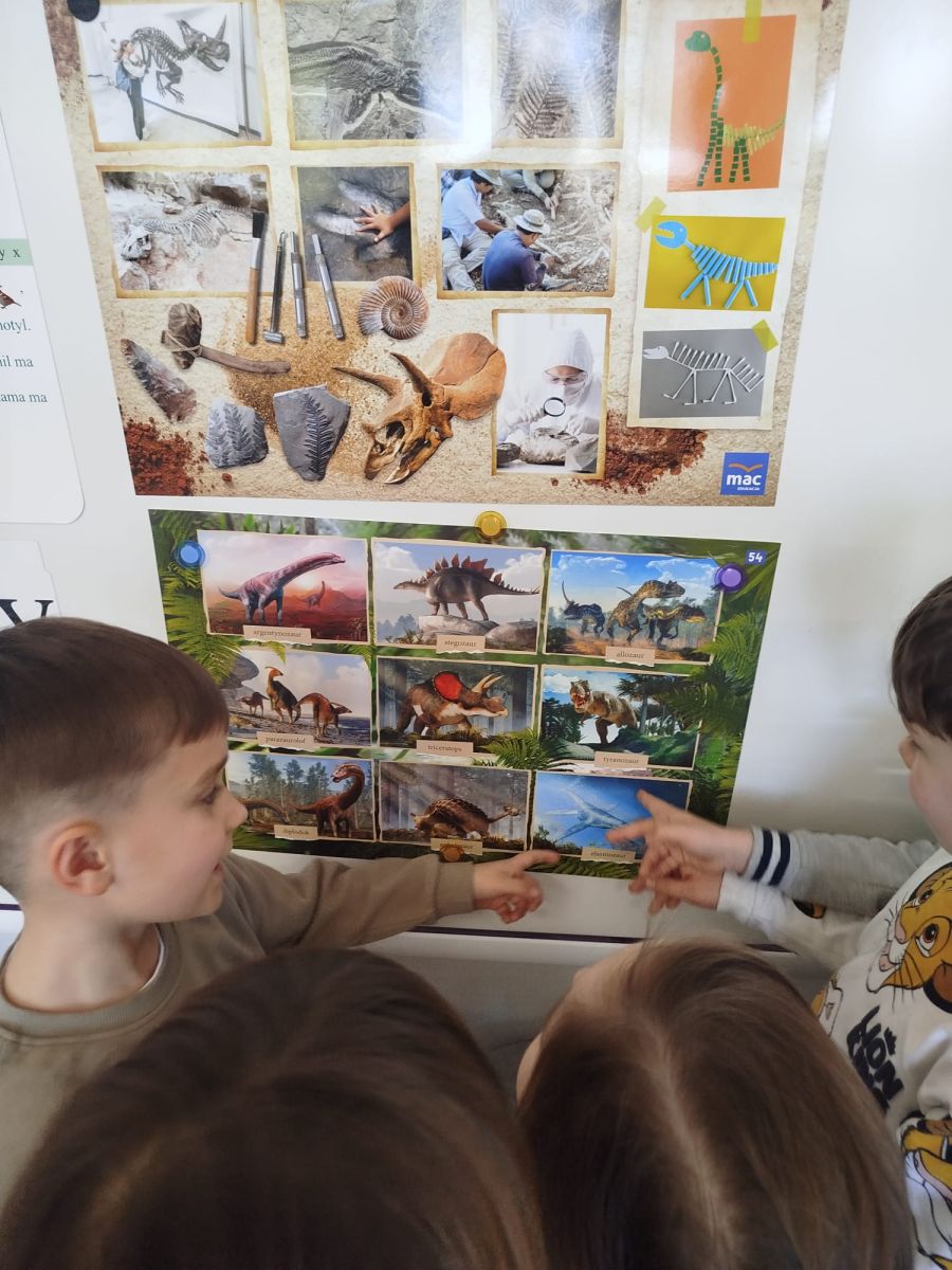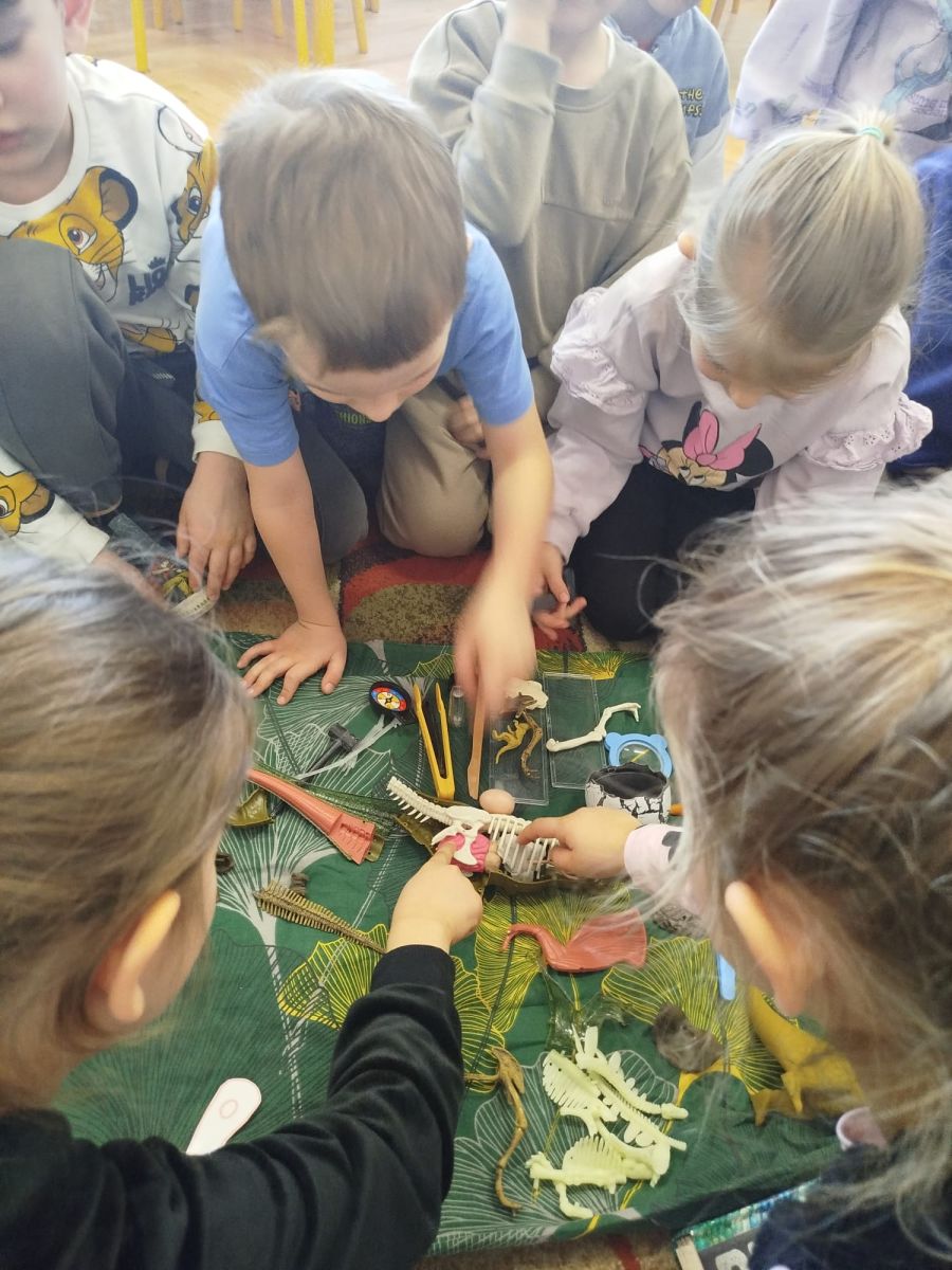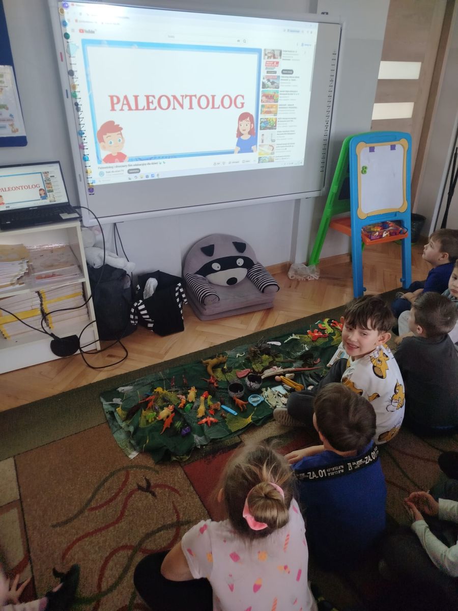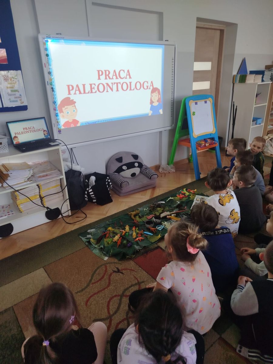 Podczas zajęć dowiedzieliśmy się, kim jest paleontolog i na czym polega jego praca. Wspólnie odkryliśmy, że paleontolog to naukowiec, który bada szczątki roślin i zwierząt sprzed milionów lat. Dzięki jego pracy możemy dziś podziwiać szkielety dinozaurów w muzeach i poznawać historię Ziemi.