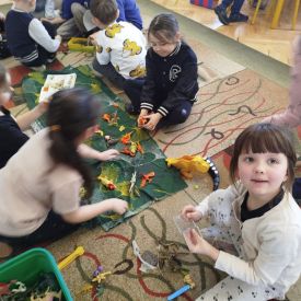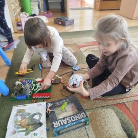 Nie zabrakło także praktycznych działań! Dzieci wcieliły się w rolę małych badaczy – z ogromnym zaangażowaniem „odkopywały” i składały szkielety dinozaurów z poszczególnych części. To zadanie wymagało skupienia i współpracy, ale sprawiło wszystkim mnóstwo radości. Była to doskonała okazja do rozwijania zdolności manualnych, logicznego myślenia oraz pracy zespołowej.