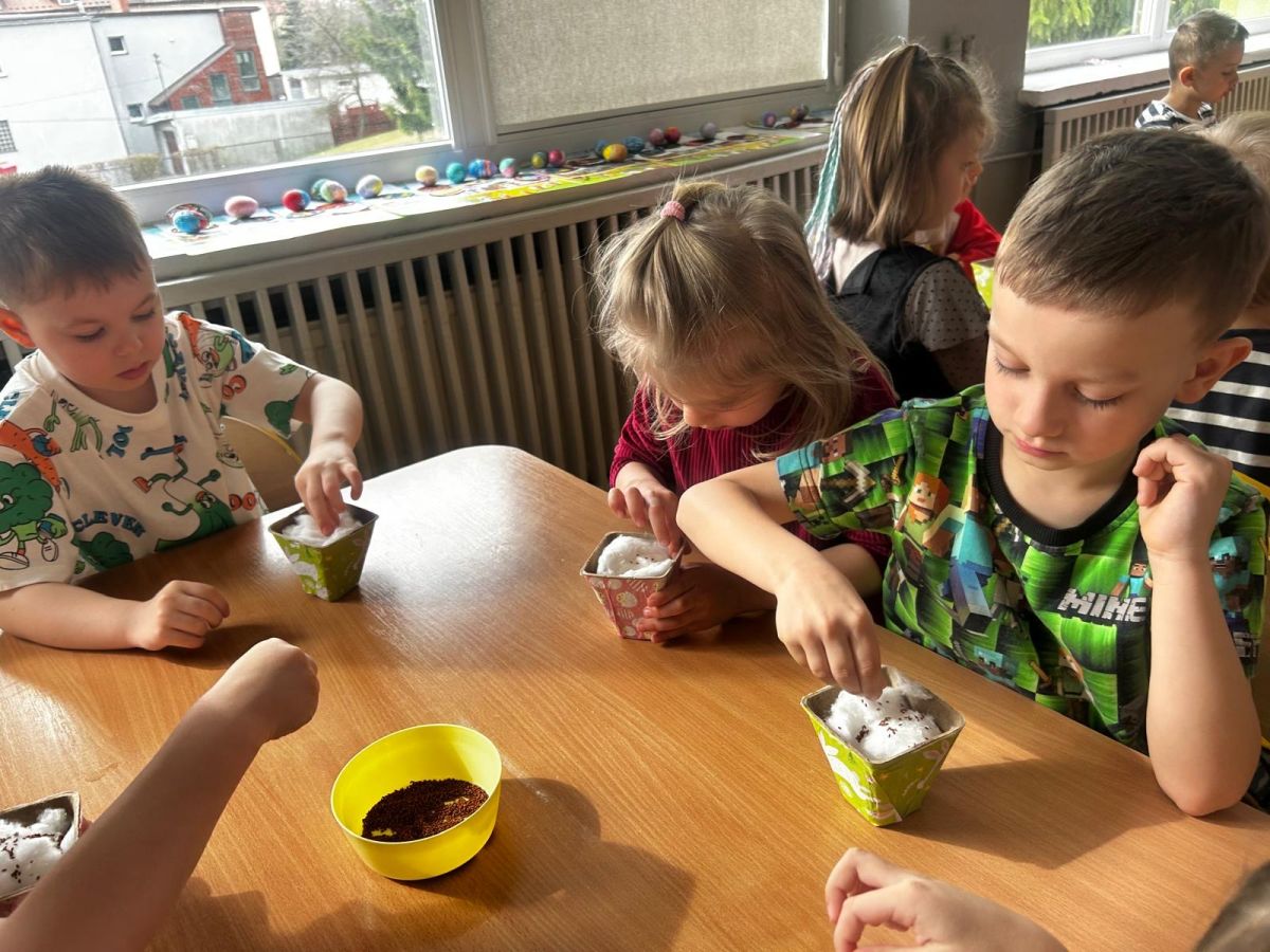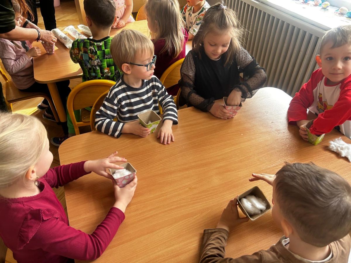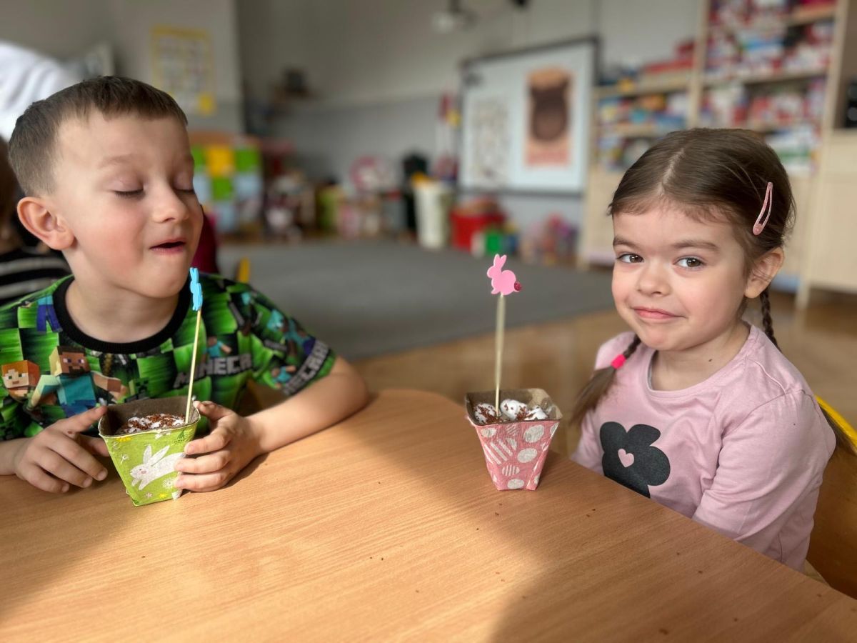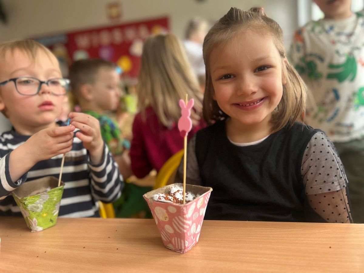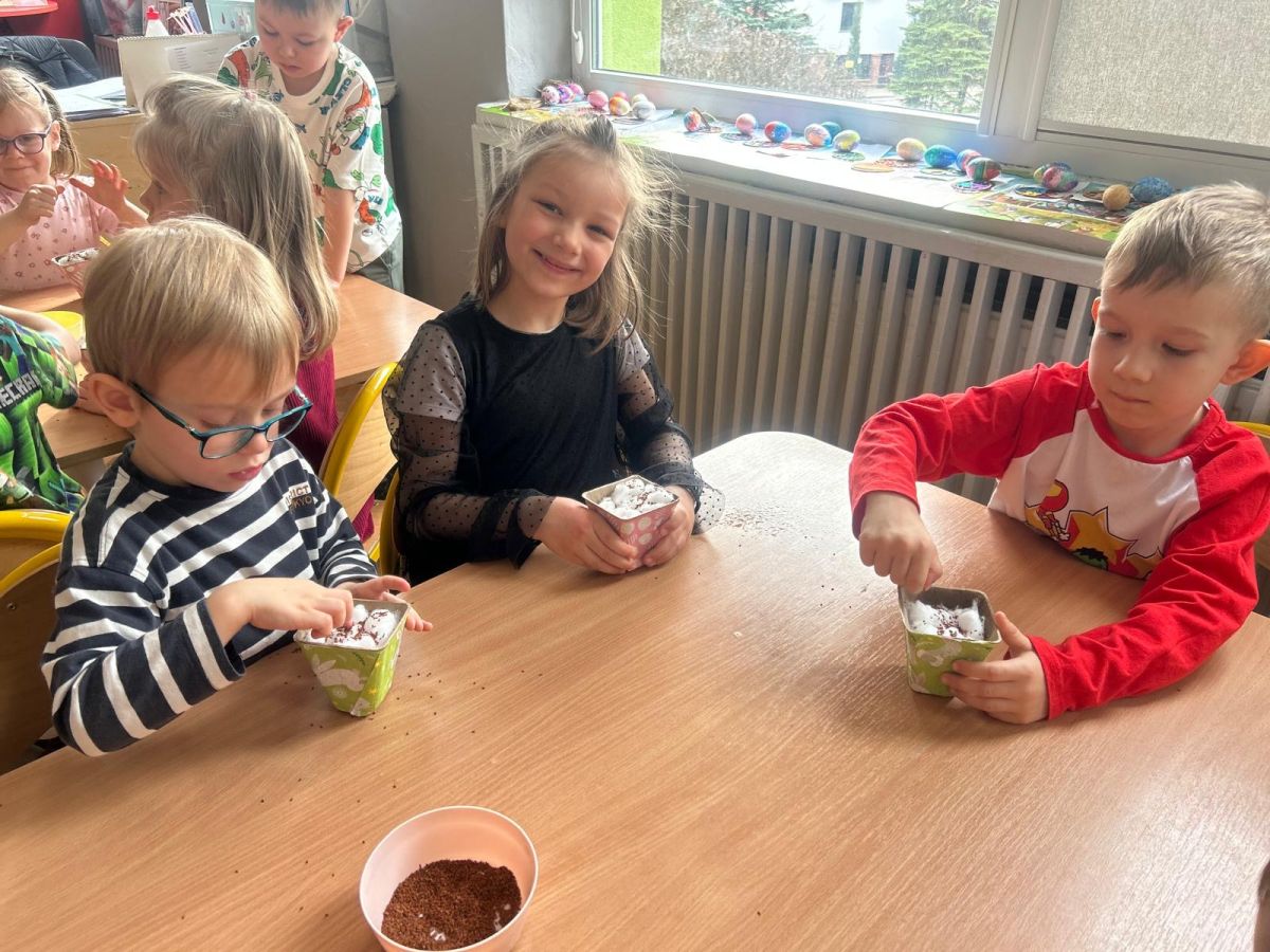 W naszym przedszkolu rozpoczęliśmy radosne przygotowania do świąt Wielkanocnych. Dzieci ze Smerfów z ogromnym zaangażowaniem tworzyły kolorowe, ozdobne pisanki, wykorzystując mazaki i inne materiały plastyczne. Każde jajko stało się małym dziełem sztuki, pełnym barw i dziecięcej wyobraźni. Nie zabrakło także tradycyjnego sadzenia rzeżuchy, które zawsze budzi wśród dzieci dużo ciekawości. Smerfy z dumą obserwują, jak z małych ziarenek wyrasta zielona pachnąca rzeżucha – symbol wiosny i nowego życia.