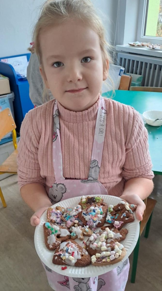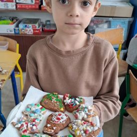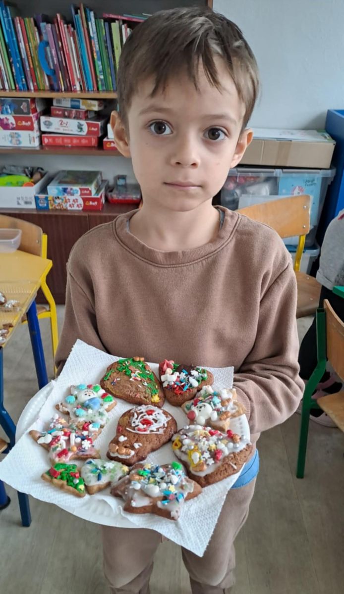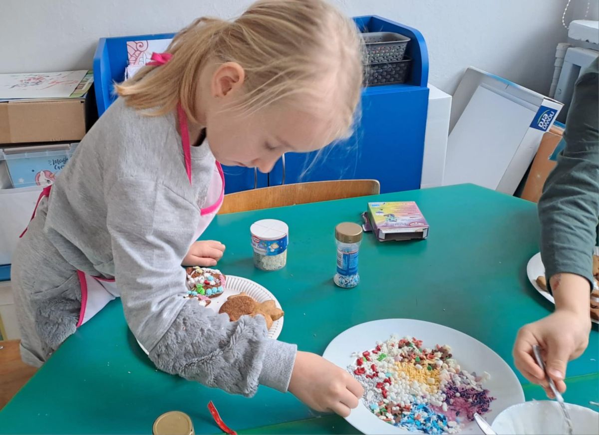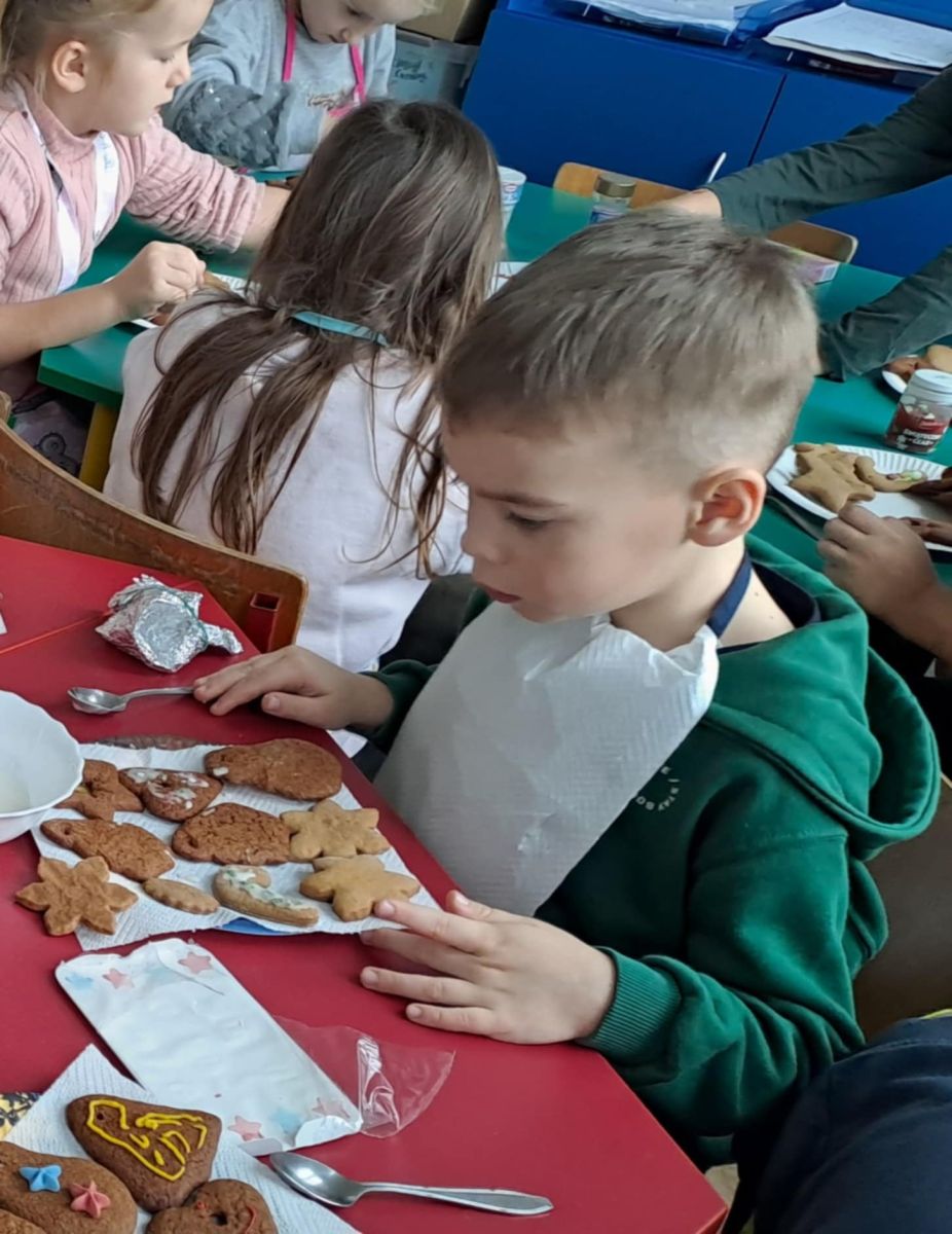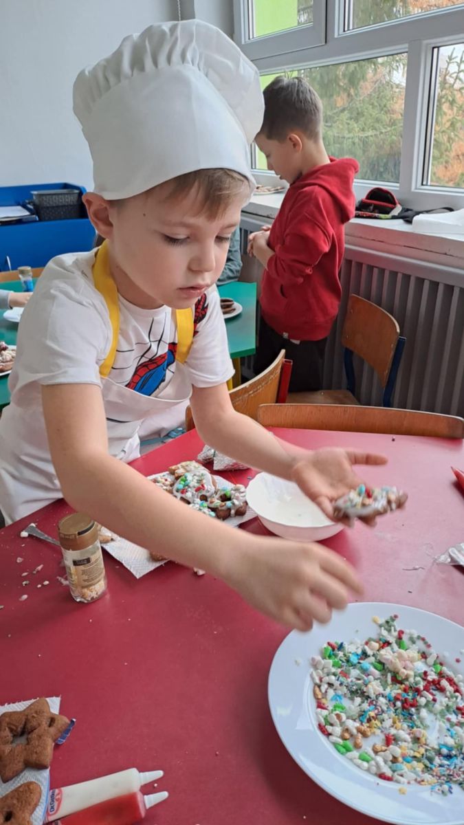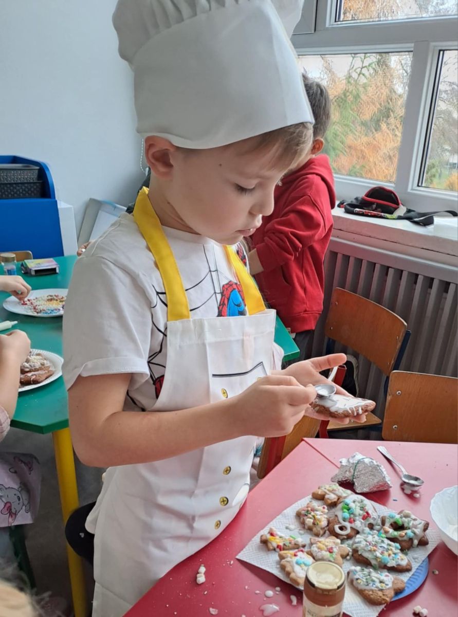 Choć do Świąt Bożego Narodzenia zostało jeszcze trochę czasu, w grupie starszaków już zagościł wyjątkowy, świąteczny nastrój. Dzieci z ogromnym zaangażowaniem przystąpiły do ozdabiania pierników, wykorzystując kolorowe lukry, posypki i dekoracje cukiernicze.