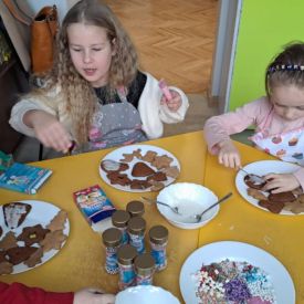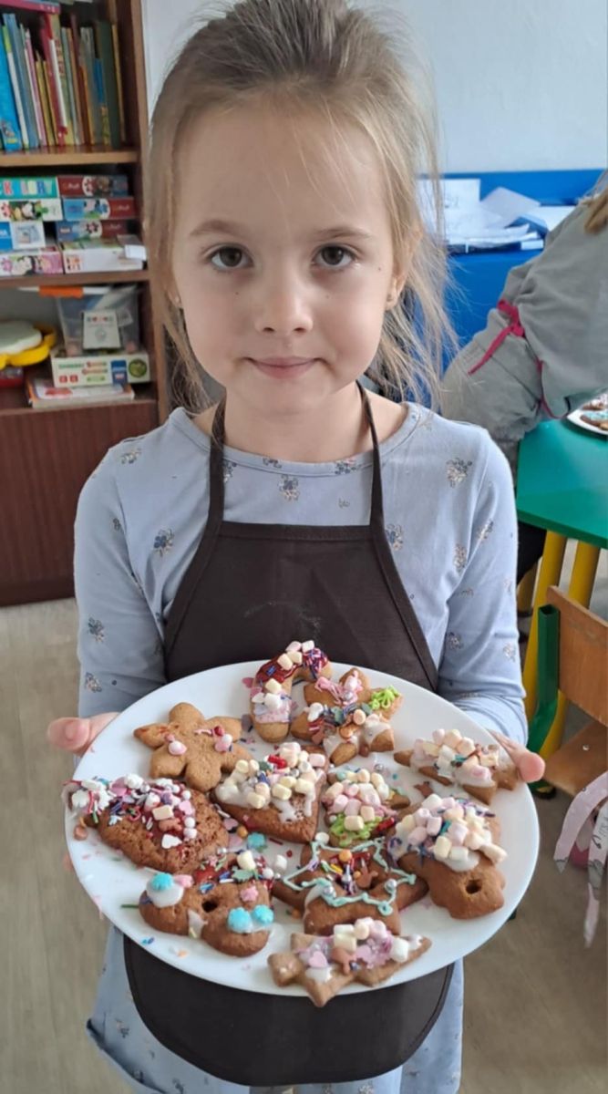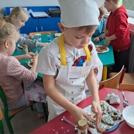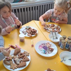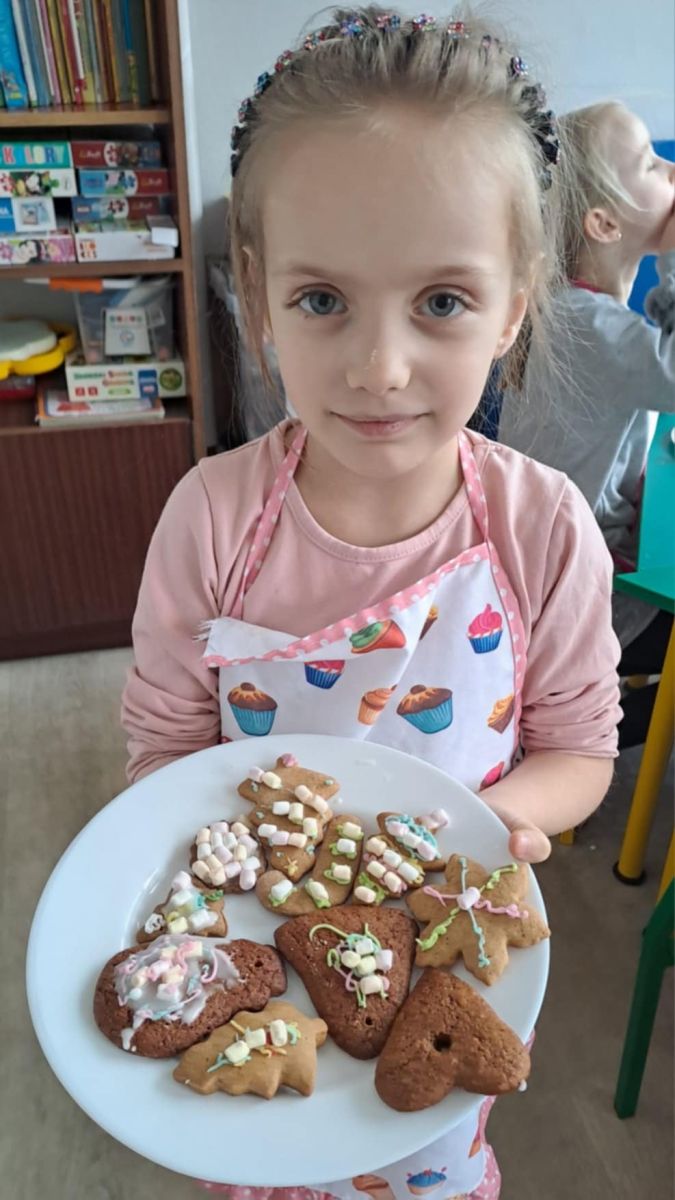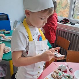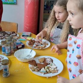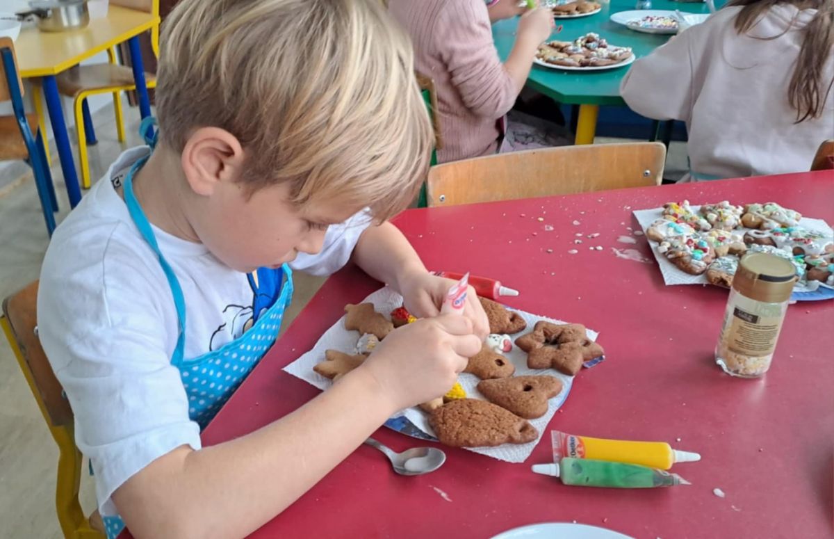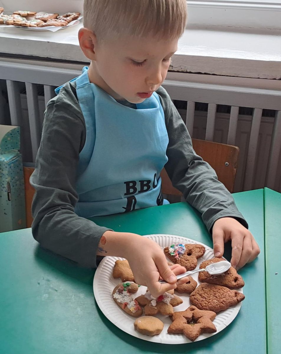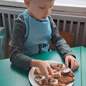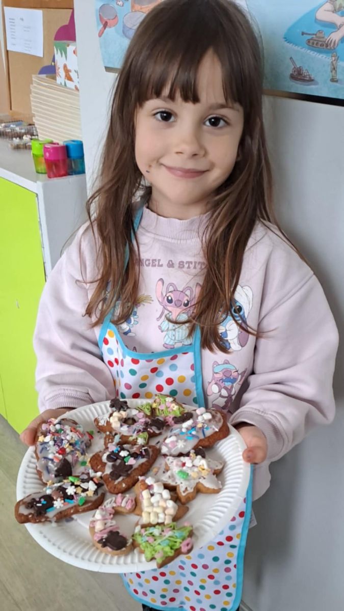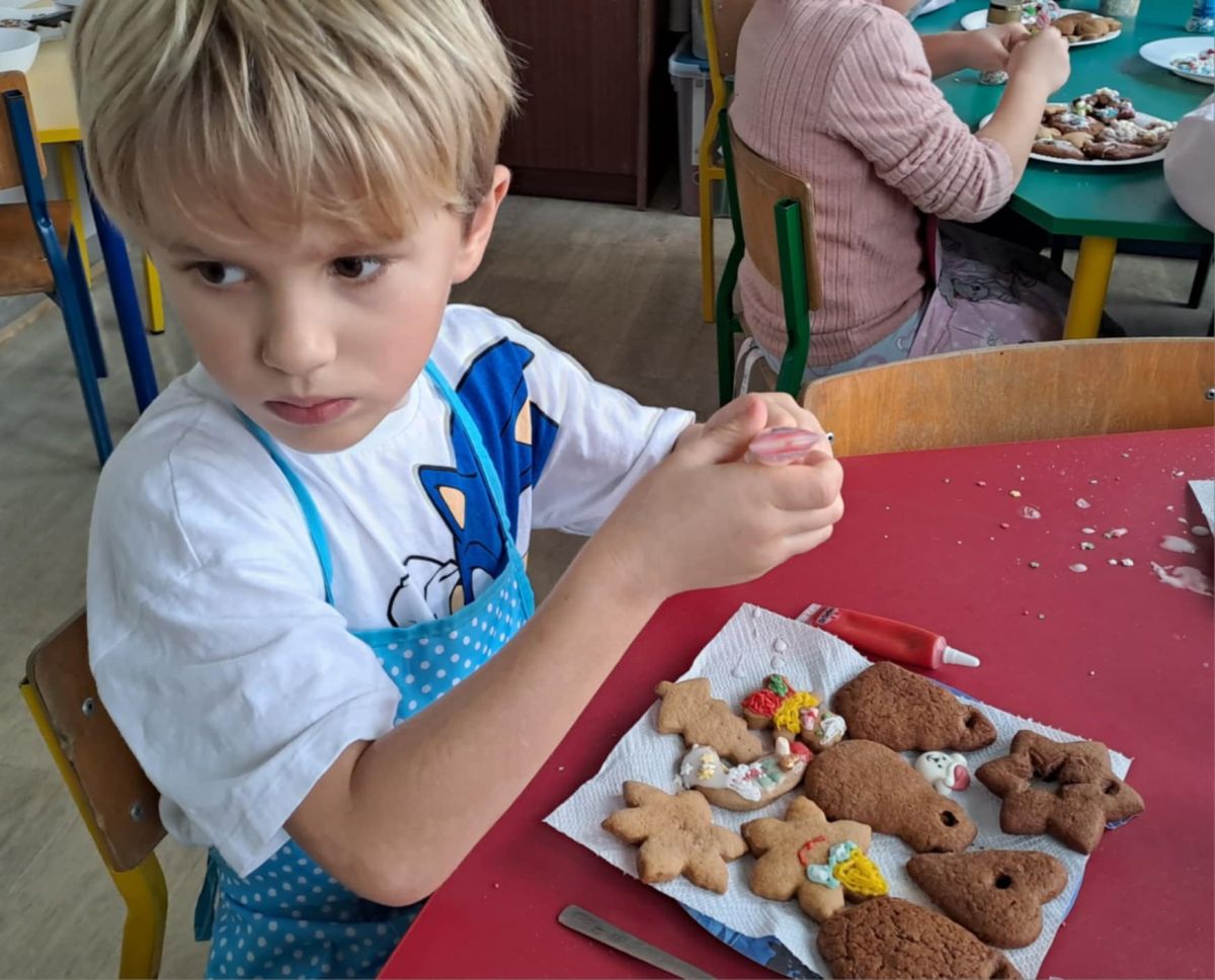Choć do Świąt Bożego Narodzenia zostało jeszcze trochę czasu, w grupie starszaków już zagościł wyjątkowy, świąteczny nastrój. Dzieci z ogromnym zaangażowaniem przystąpiły do ozdabiania pierników, wykorzystując kolorowe lukry, posypki i dekoracje cukiernicze.