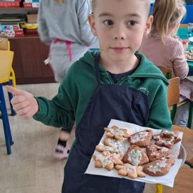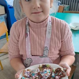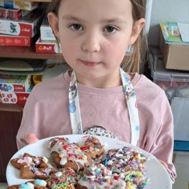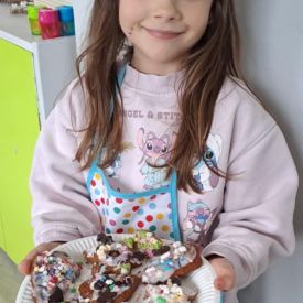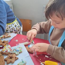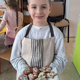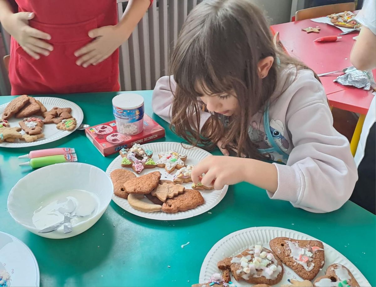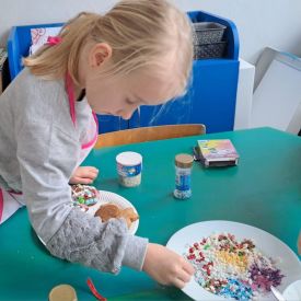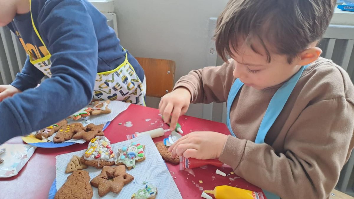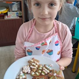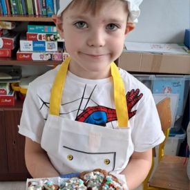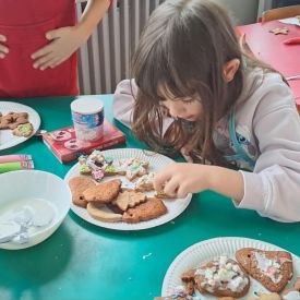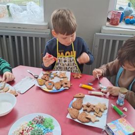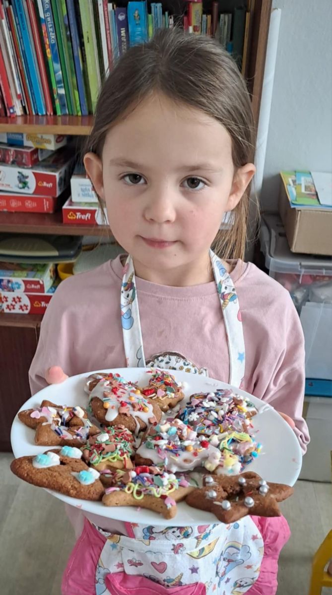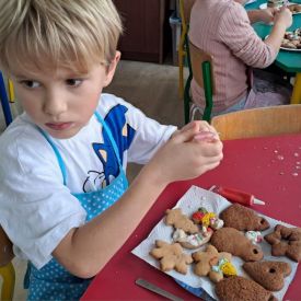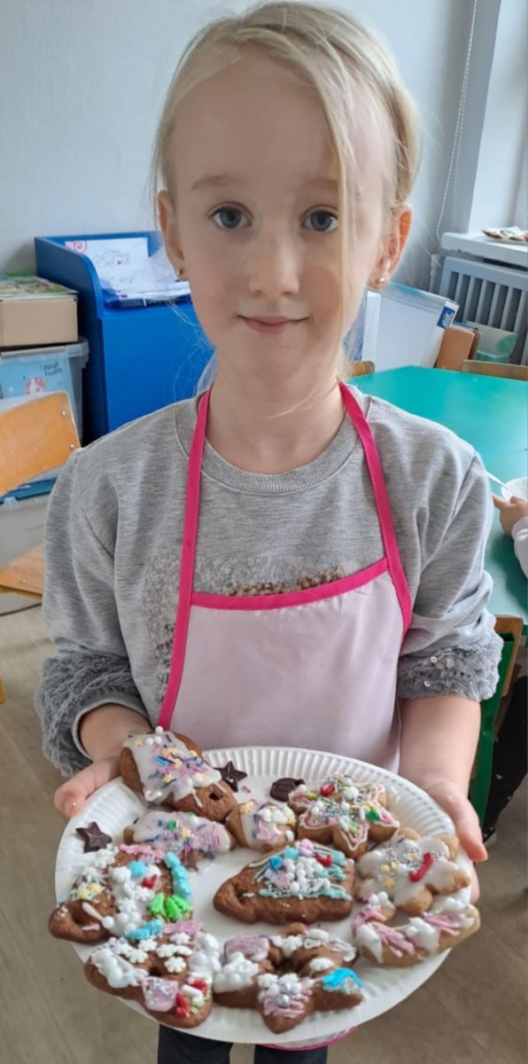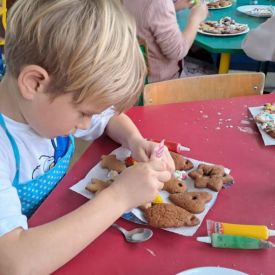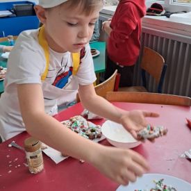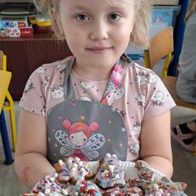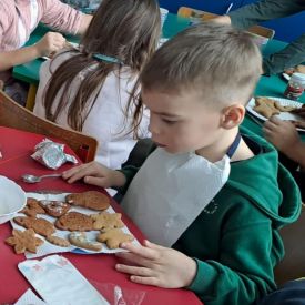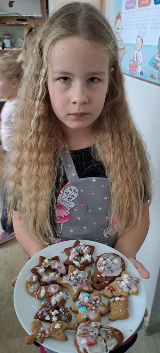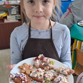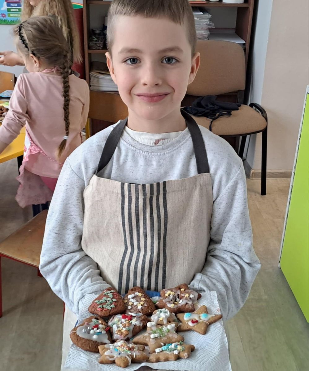 Choć do Świąt Bożego Narodzenia zostało jeszcze trochę czasu, w grupie starszaków już zagościł wyjątkowy, świąteczny nastrój. Dzieci z ogromnym zaangażowaniem przystąpiły do ozdabiania pierników, wykorzystując kolorowe lukry, posypki i dekoracje cukiernicze.