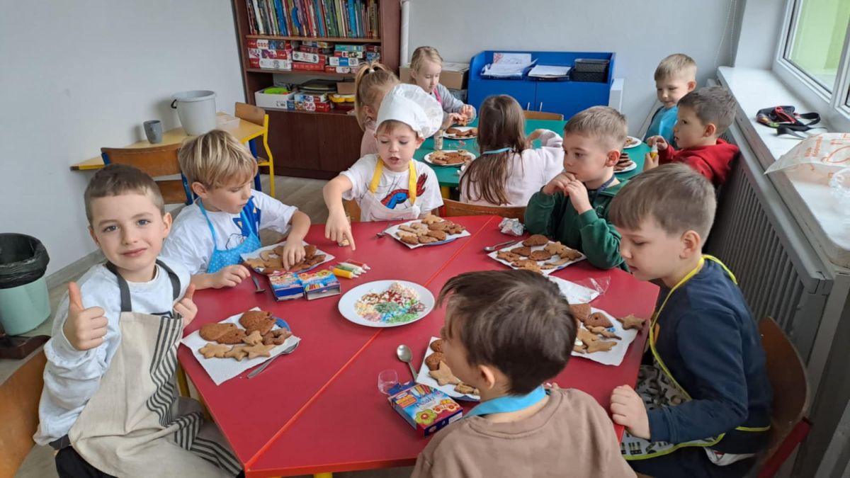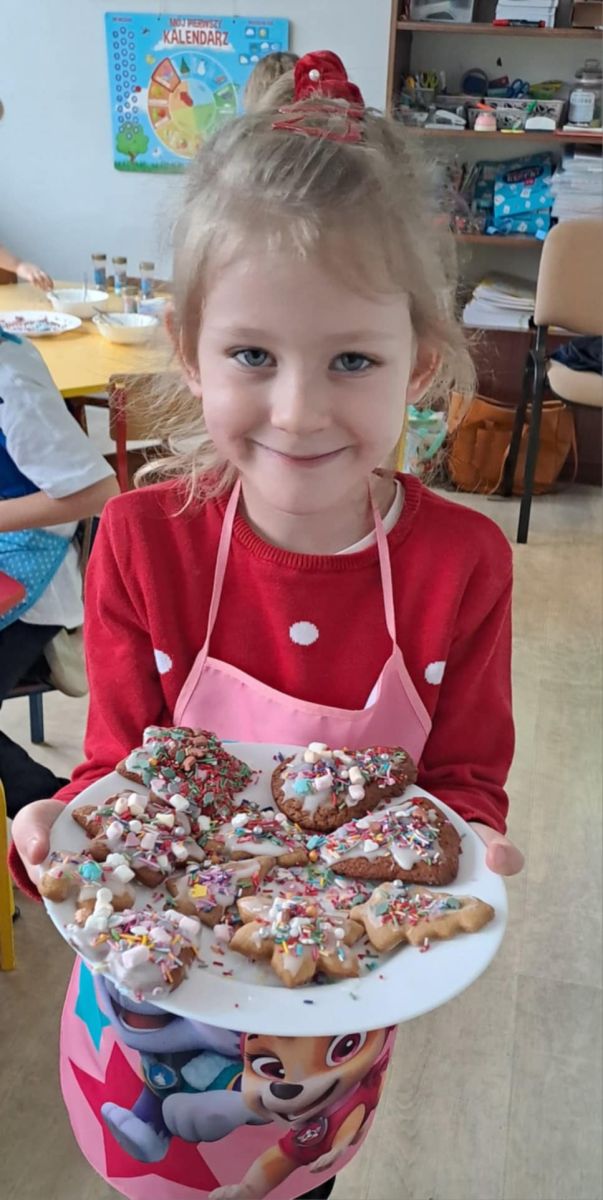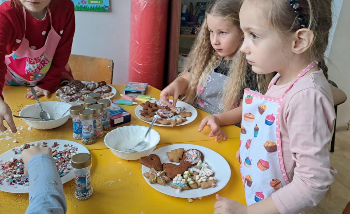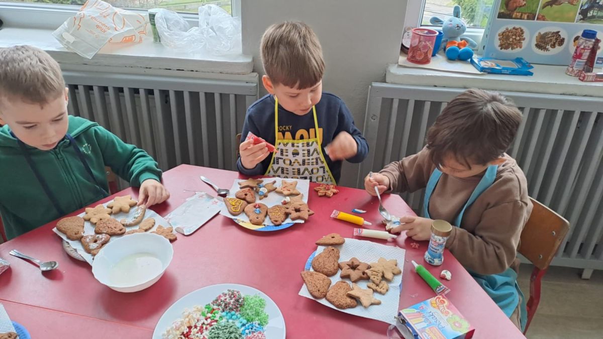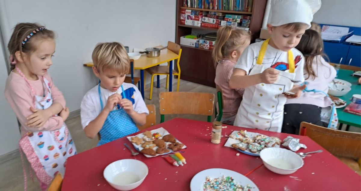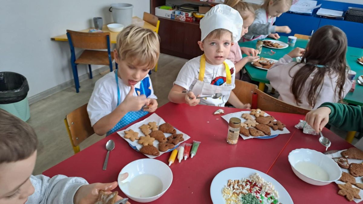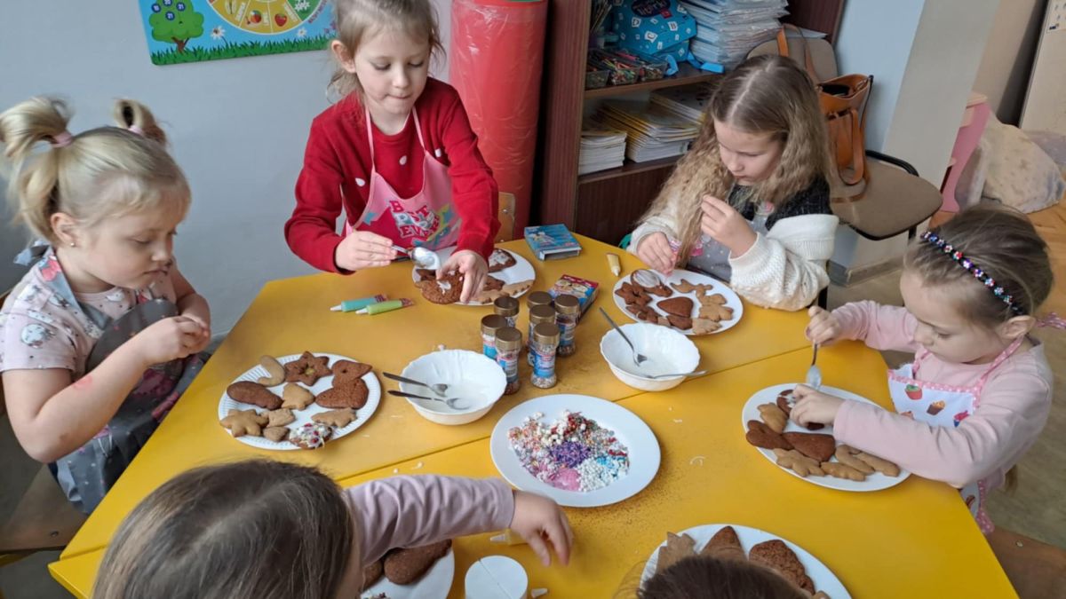 Przedszkolaki wykazały się dużą kreatywnością i precyzją, a każdy piernik stał się małym, słodkim dziełem sztuki. W sali unosił się zapach korzennych przypraw, a uśmiechy dzieci były najlepszym dowodem na to, że wspólne przygotowania do świąt sprawiają wiele radości – nawet jeśli te święta są jeszcze przed nami.