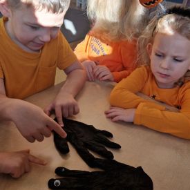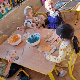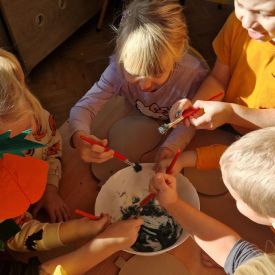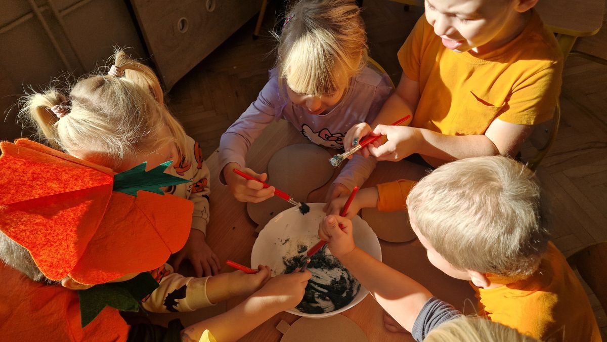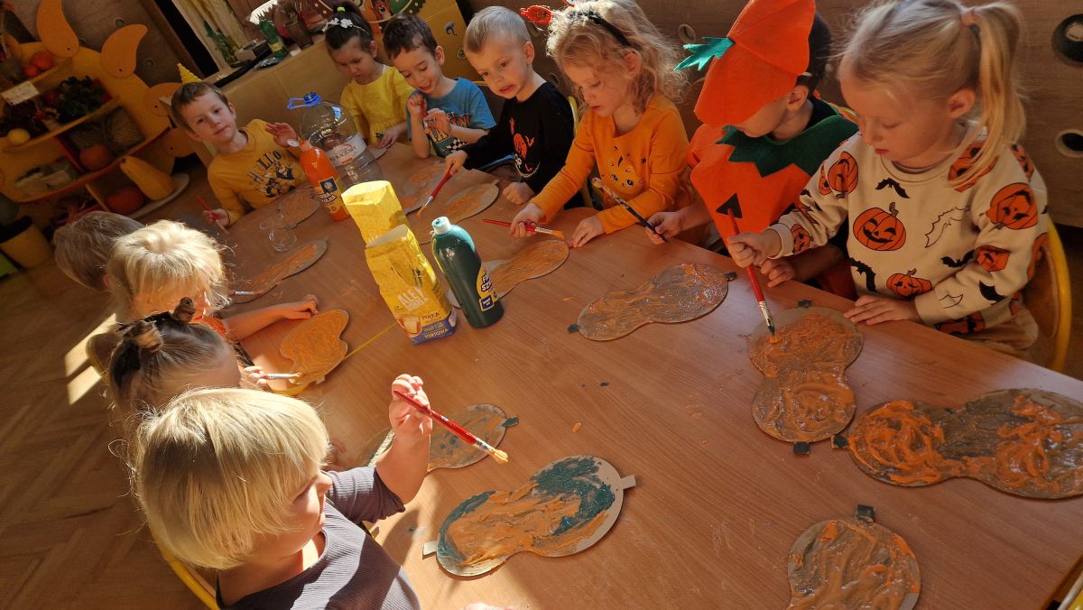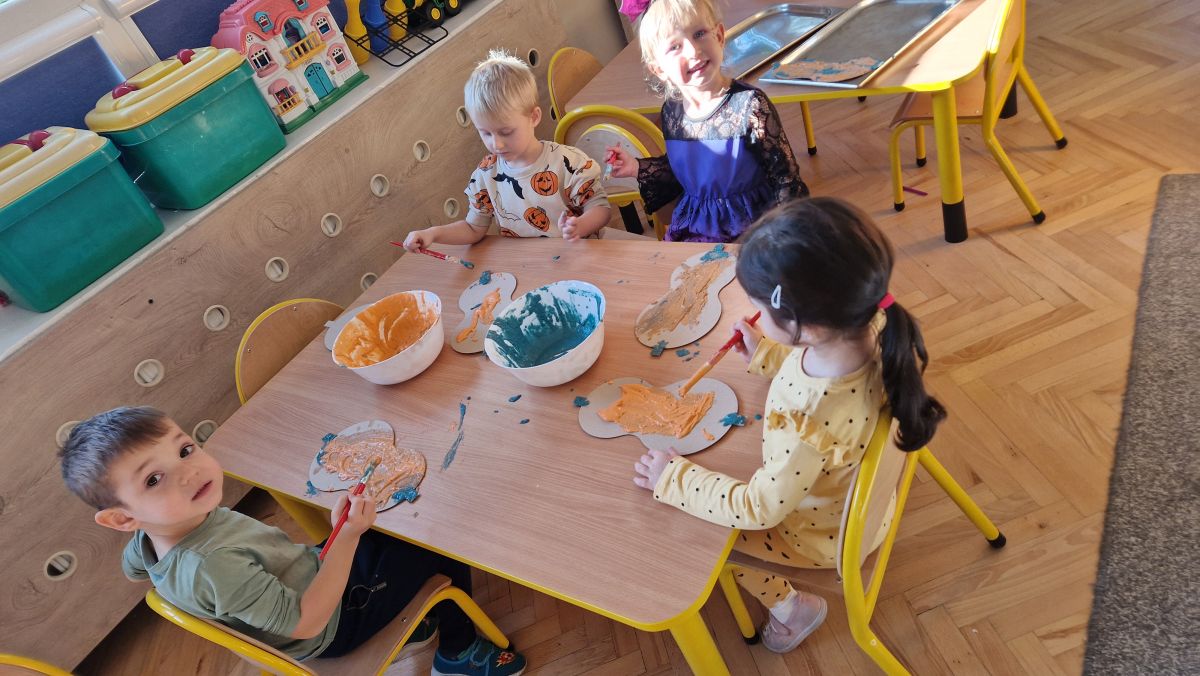 Podczas zajęć plastycznych przedszkolaki stworzyły wyjątkowe prace 3D. Przygotowały specjalną „dyniową miksturę” z mąki, soli, sody, wody i farby, którą nałożyły na tekturki. Gotowe prace zostały następnie „wypieczone” w piecu – efekt był naprawdę imponujący!