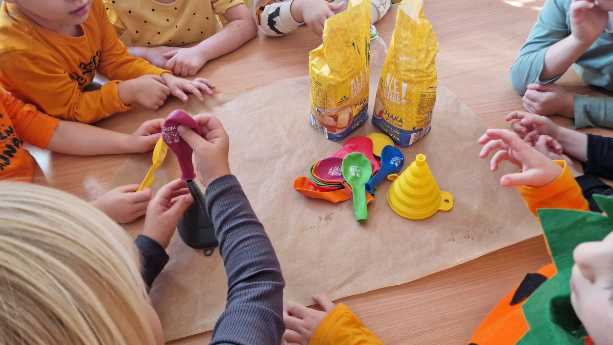 Nie zabrakło też eksperymentów. Dzieci z ogromnym zaciekawieniem obserwowały, jak przy użyciu octu i sody można napompować rękawiczkę – powstały z tego prawdziwie szalone rękawiczki!